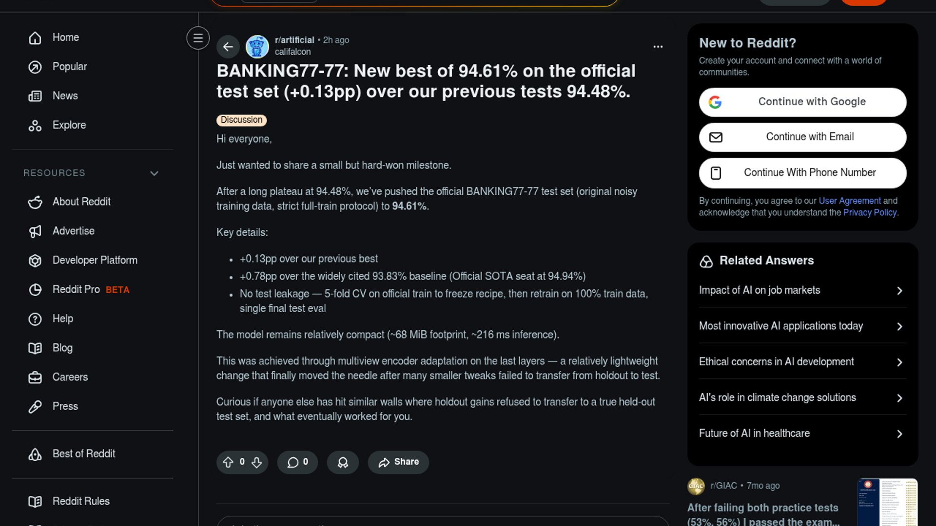 Researchers have achieved a new performance milestone on the BANKING77 intent classification benchmark, reaching 94.61% accuracy on the official test set. This +0.13pp improvement over previous bests was realized using multiview encoder adaptation on the model's final layers, a technique that effectively transferred validation gains to the final evaluation. The model remains highly efficient with a 68 MiB footprint and 216 ms inference time, proving that high-accuracy intent classification doesn't require massive computational overhead or oversized model architectures.