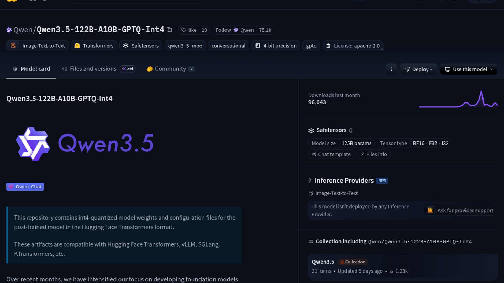 A Reddit guide shows Qwen3.5-122B-A10B-GPTQ-Int4 running on four Radeon AI PRO R9700s under vLLM ROCm with a working long-context config. On a real 41k-context task, it reported 34.9 s TTFT, 101.7 s total time, and roughly 4,150 tok/s prompt throughput.