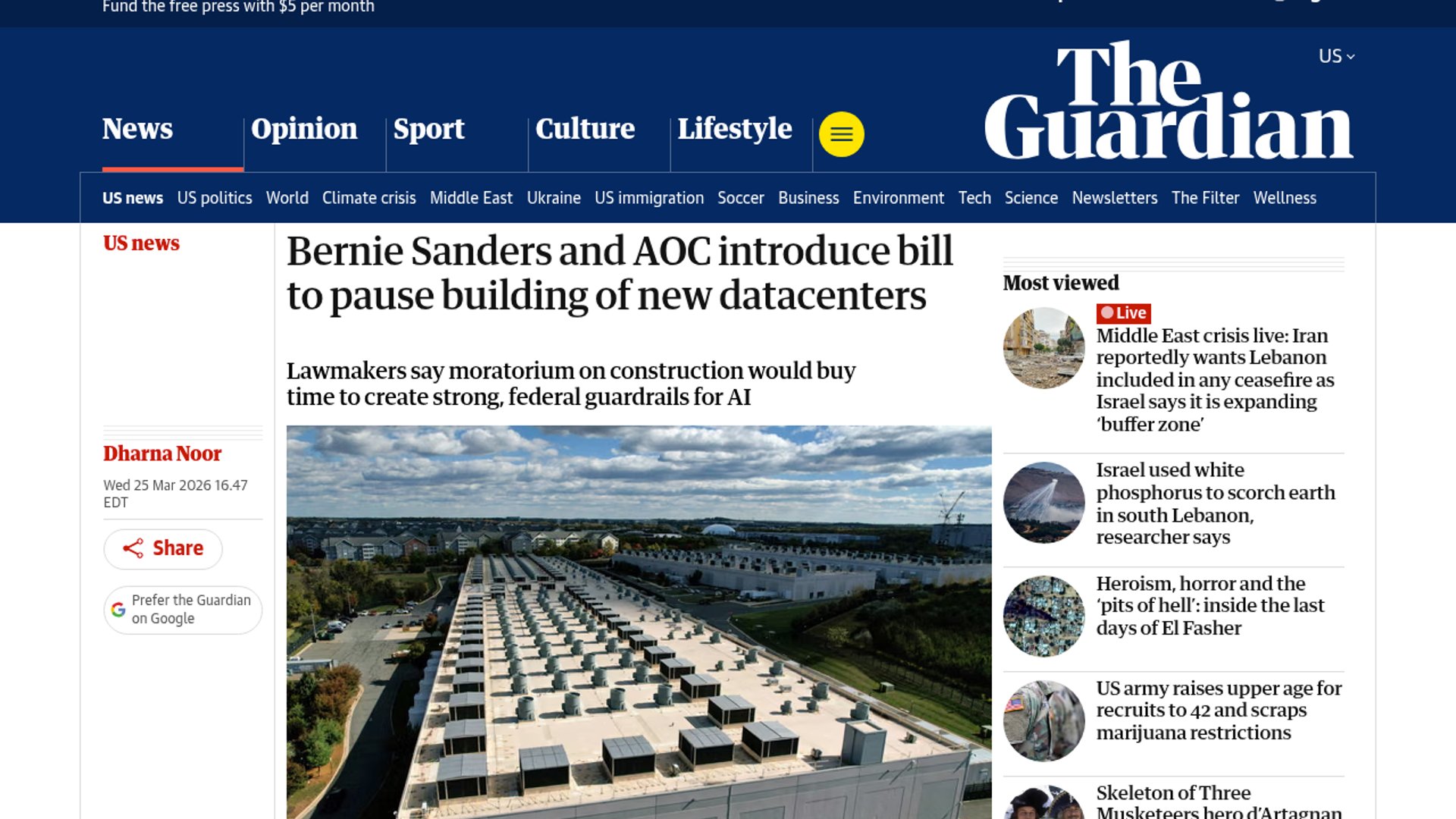 This is less a near-term legislative path than a pressure campaign on the AI buildout boom, but it matters because it turns data center expansion into a public-interest fight, not just an engineering one.