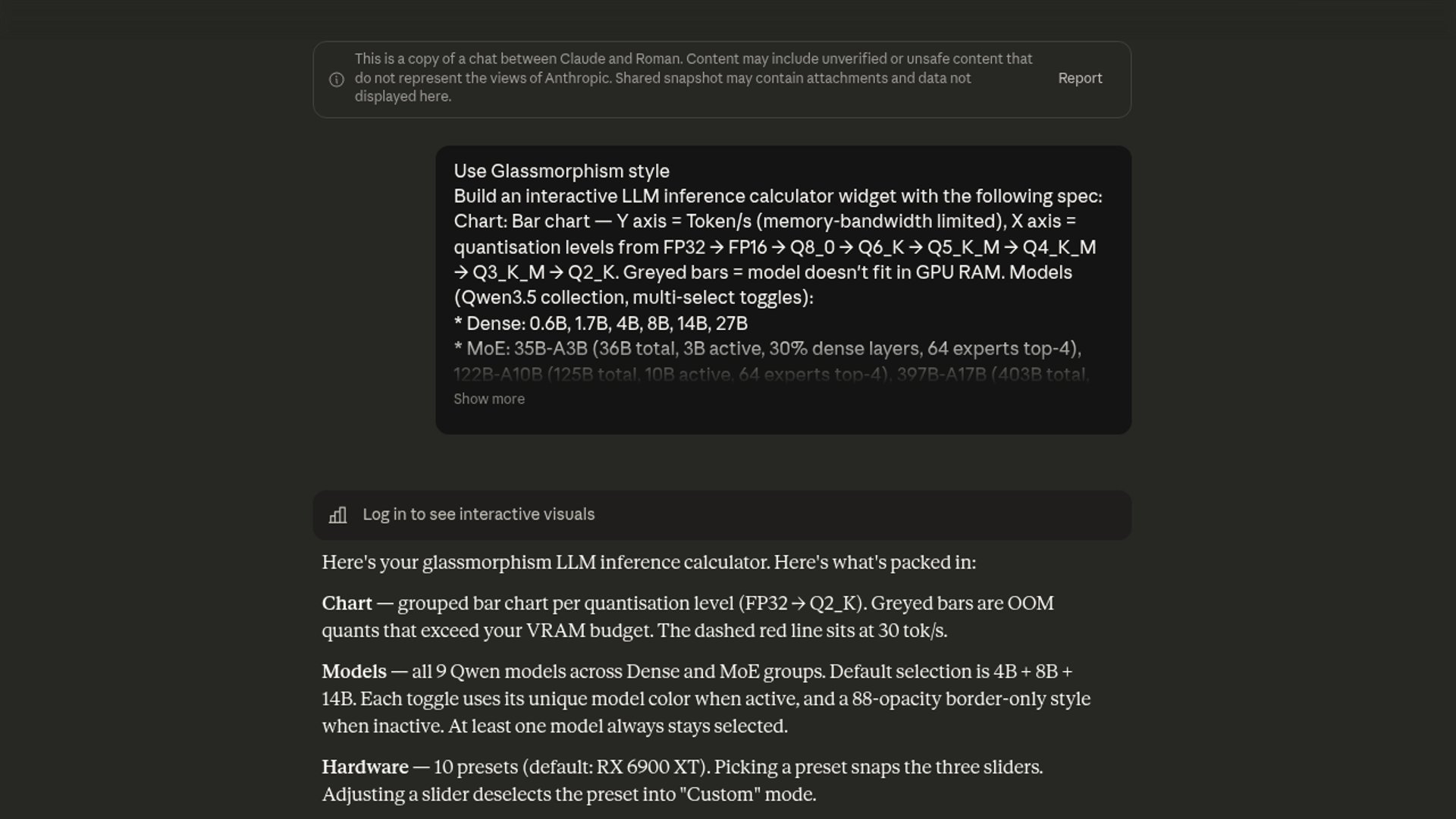 A Reddit user turned Anthropic’s new Claude visual/chat output into an interactive LLM inference calculator for Qwen3.5 models, complete with hardware presets, quantization bars, and RAM-fit logic. It’s part demo, part prompt template, and a good example of how fast Claude can now scaffold functional UI from a spec.