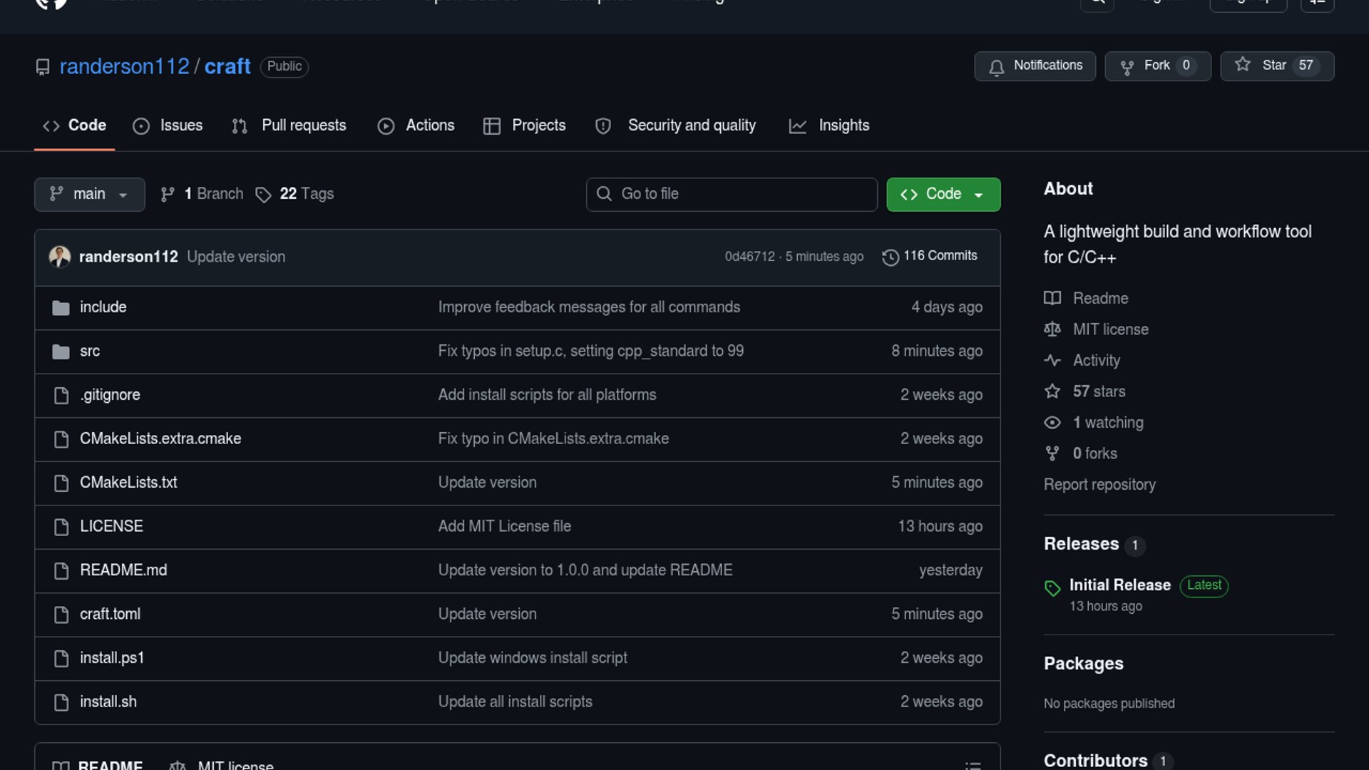Craft is a lightweight build and workflow tool for C and C++ that replaces a lot of early-project boilerplate with a simple `craft.toml`. It generates `CMakeLists.txt`, manages git and local dependencies, supports templates and file scaffolding, and offers a few escape hatches for custom CMake when needed. The pitch is straightforward: spend less time wiring up build files and more time writing code.