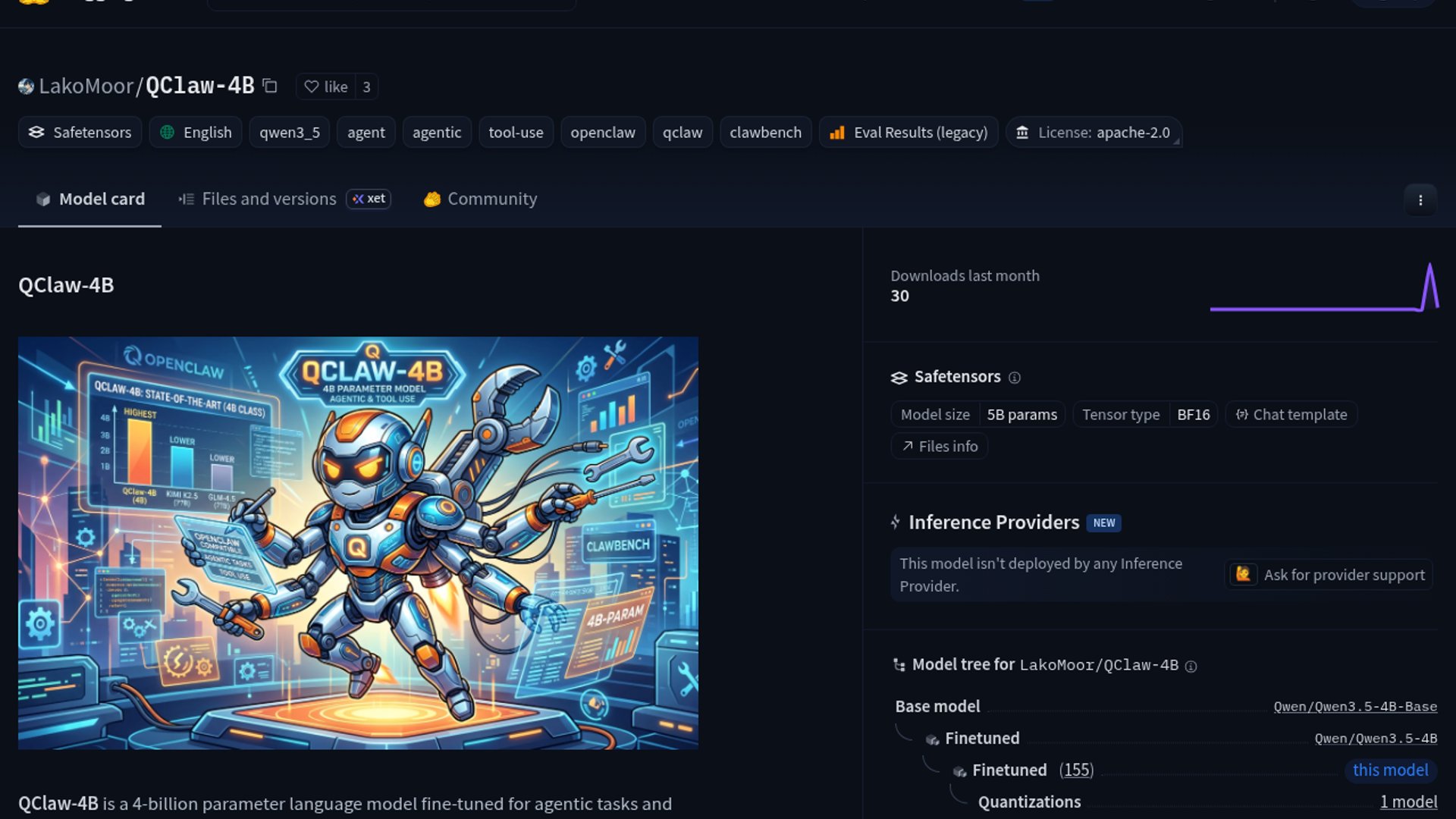 QClaw-4B is a 4-billion parameter model fine-tuned for agentic workflows and tool use, matching the performance of models several times its size on the ClawBench benchmark. It represents a major step forward for local agentic capabilities in a compact footprint.