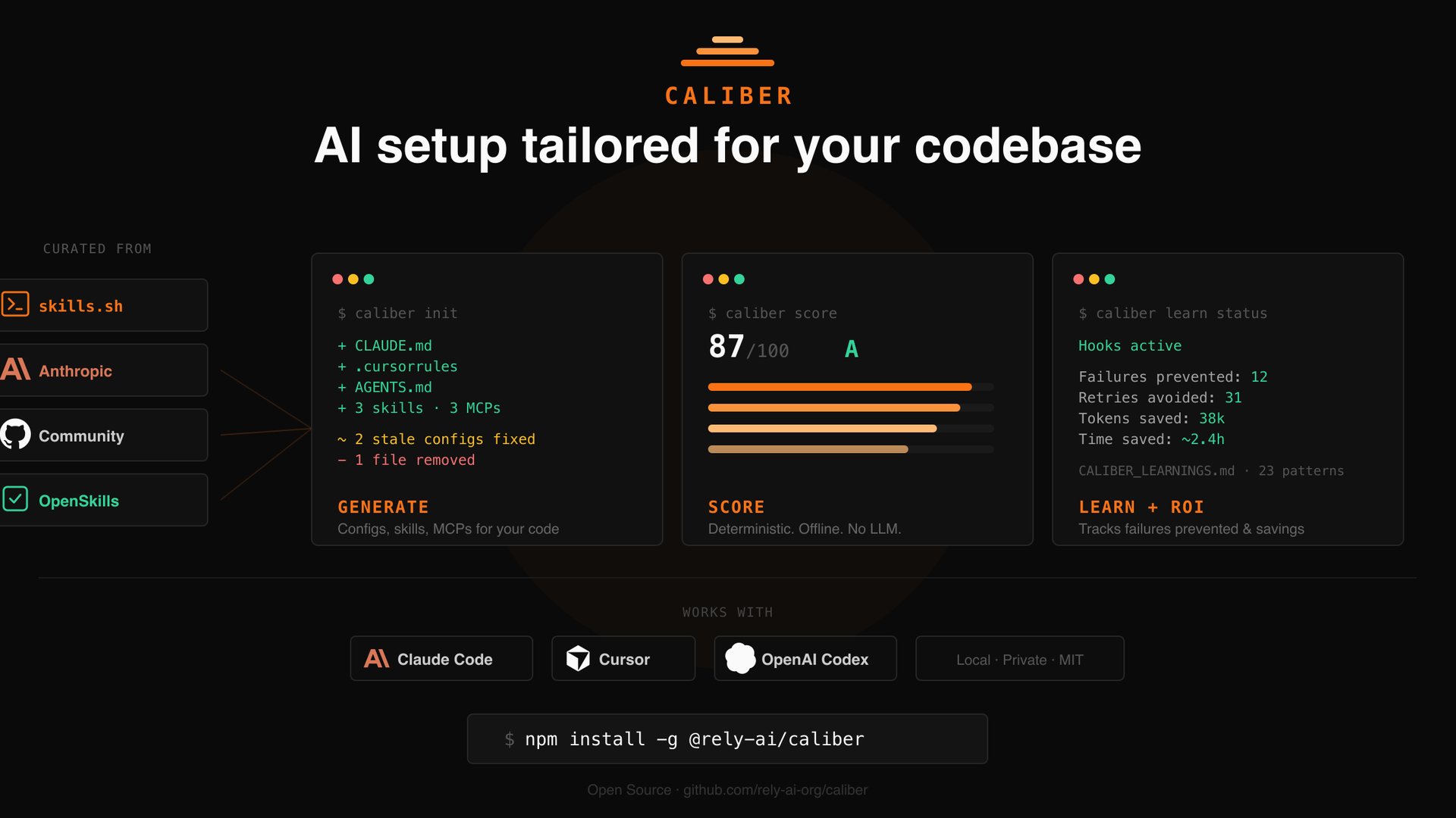 - –Features a deterministic `caliber score` command to audit configuration quality locally without spending LLM tokens