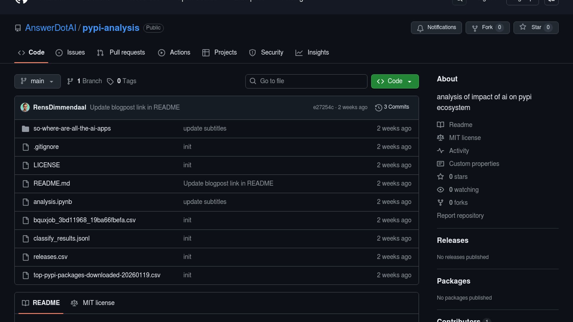 Answer.AI's pypi-analysis looks at PyPI release data to test whether the ChatGPT era produced a broad software boom. It finds almost no change in overall package creation, while popular AI-related packages show a clear rise in update frequency.