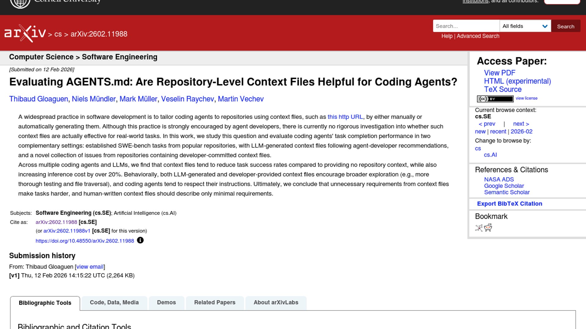 This paper benchmarks repository-level instruction files like AGENTS.md and CLAUDE.md across multiple coding agents, finding they usually raise inference cost by more than 20% while slightly hurting task success. The practical takeaway for AI-heavy dev teams is blunt: keep repo guidance minimal, specific, and focused on non-obvious constraints instead of restating what the codebase already says.