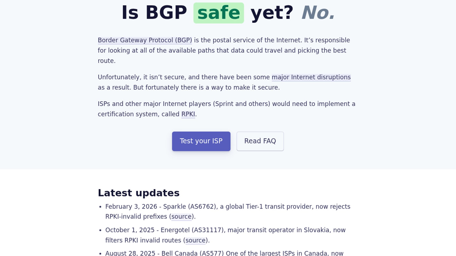 Is BGP safe yet? is a Cloudflare site that checks whether your ISP filters invalid BGP routes using RPKI origin validation. The test works by attempting to load content from an intentionally invalid route: if it succeeds, your network accepted a route it should have rejected.