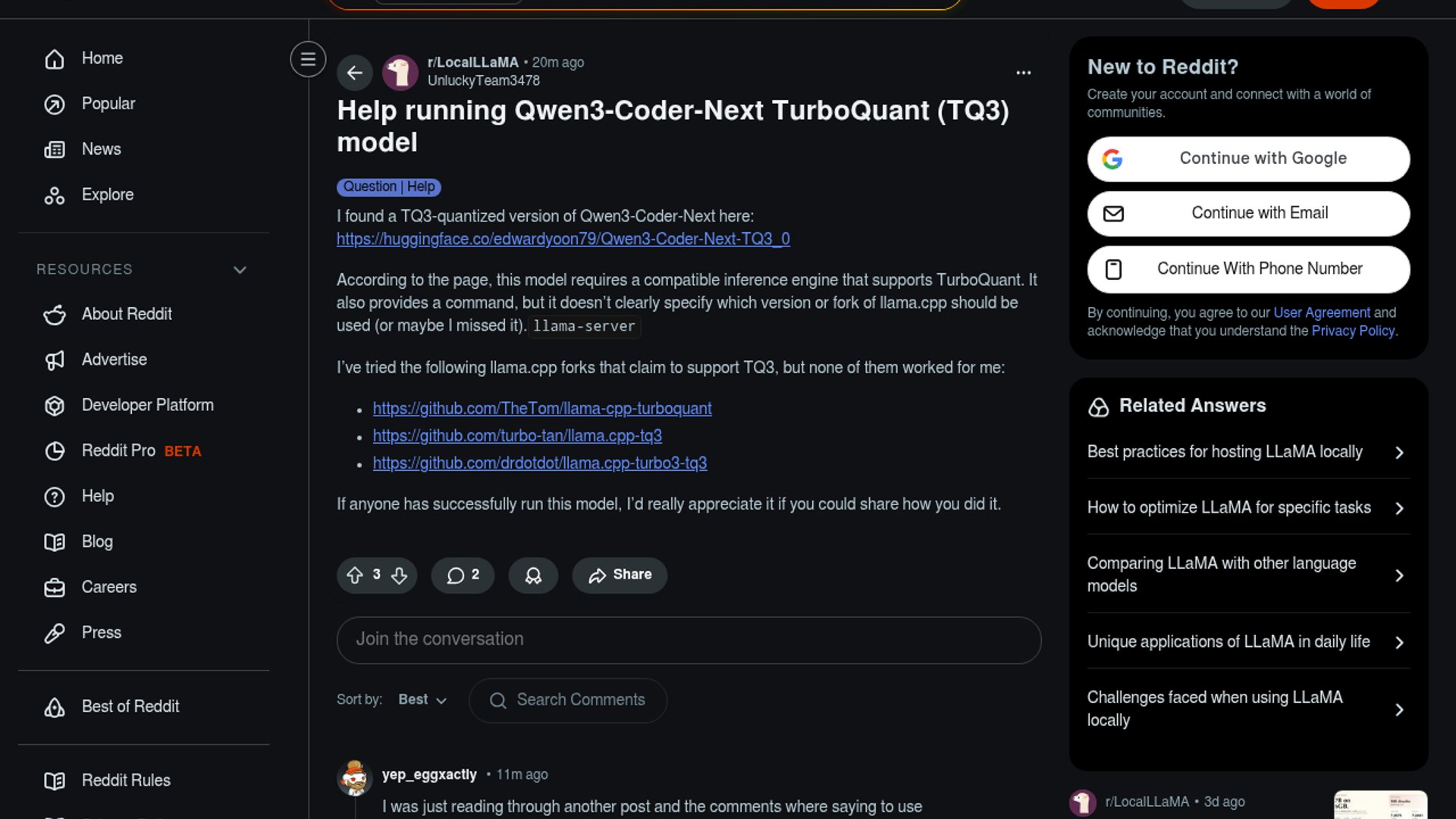 - –TurboQuant (TQ3) appears to be an emerging quantization format but lacks unified support in mainline llama.cpp