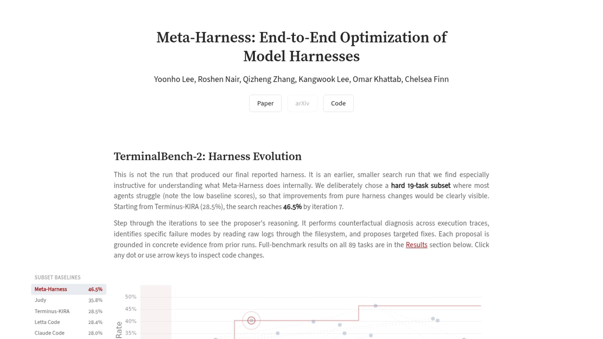 - –On TerminalBench-2, Meta-Harness reports 76.4% on Claude Opus 4.6 versus 58.0 for Claude Code, and 37.6% on Claude Haiku 4.5 versus 27.5 for Claude Code.