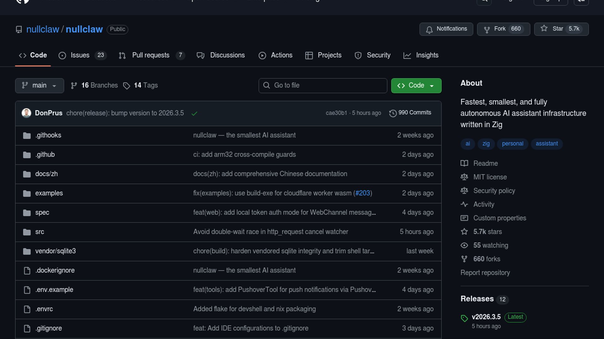 - –The repo positions nullclaw as a zero-runtime-dependency agent system with multi-provider LLM support, hybrid SQLite plus vector memory, and broad channel coverage from CLI to Telegram, Discord, Slack, and WhatsApp