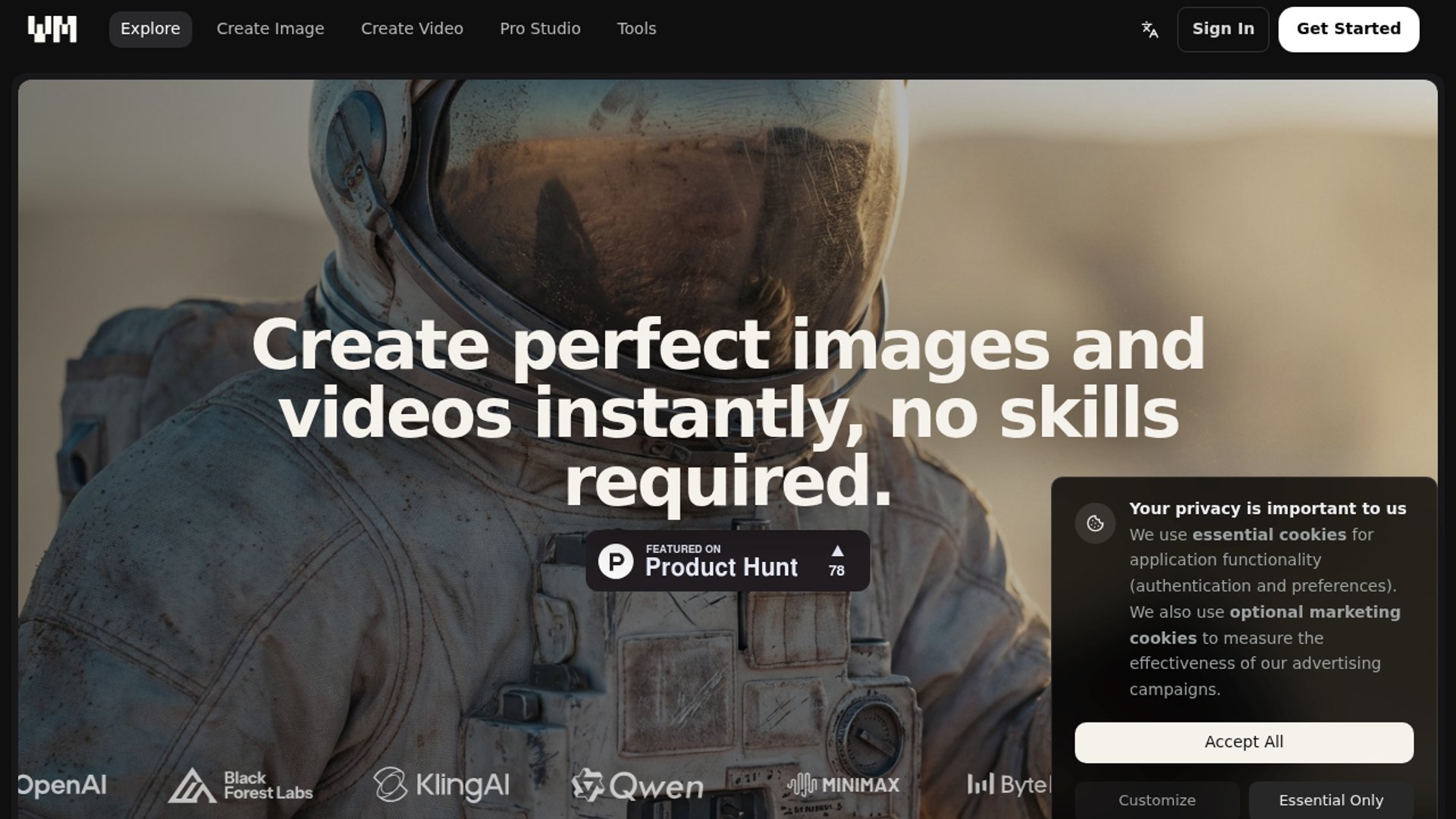 - –The launch page emphasizes campaign-ready outputs, especially for ads, reels, social content, and branded visuals.