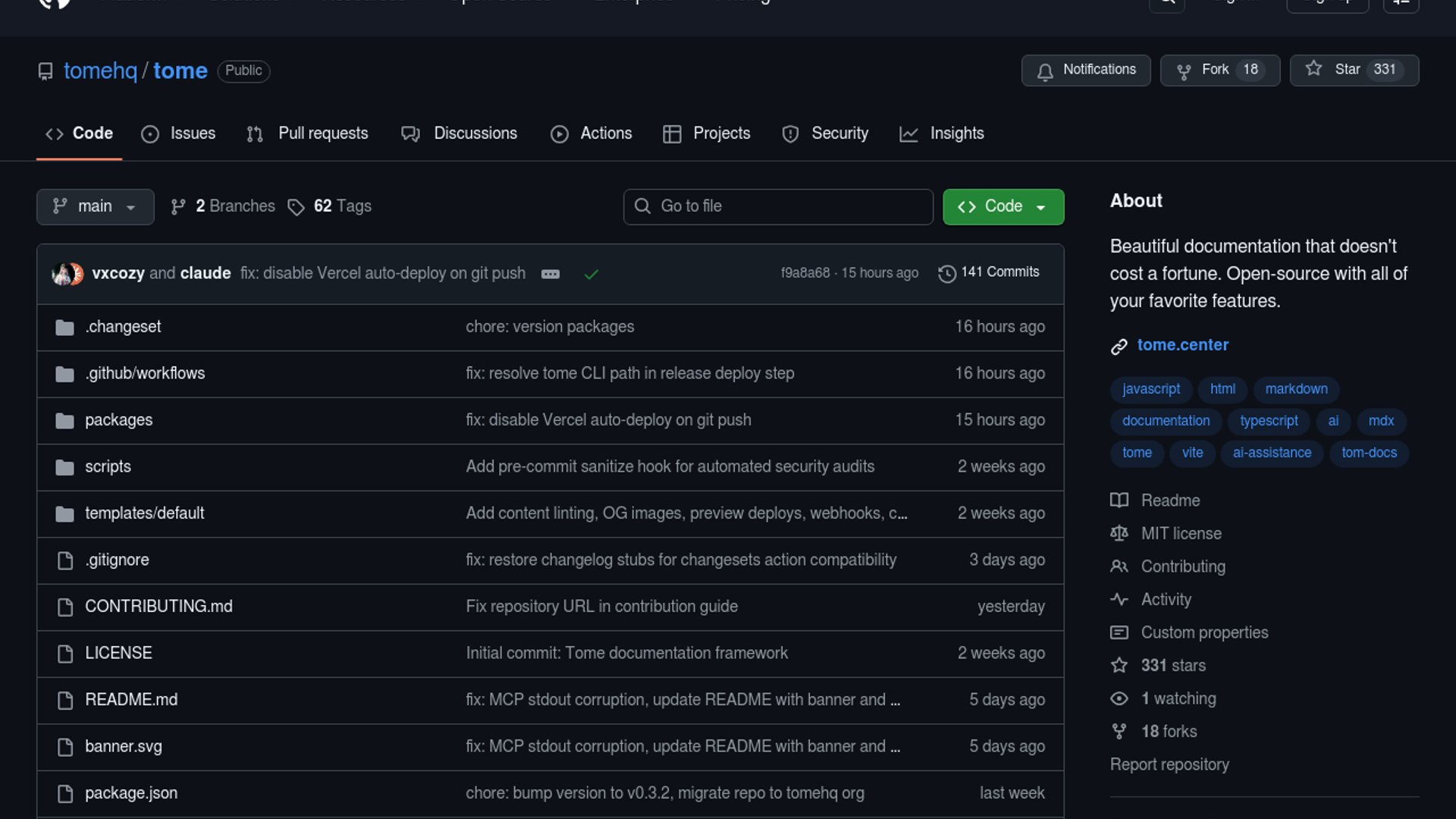 Tome is an open-source docs platform for developers that blends Markdown/MDX docs, built-in search, dark mode, and GitHub-friendly deployment. Its key hook is autonomous maintenance: it analyzes pushes for doc impact, detects gaps from code diffs, and opens reviewable PRs in the repo’s style.
