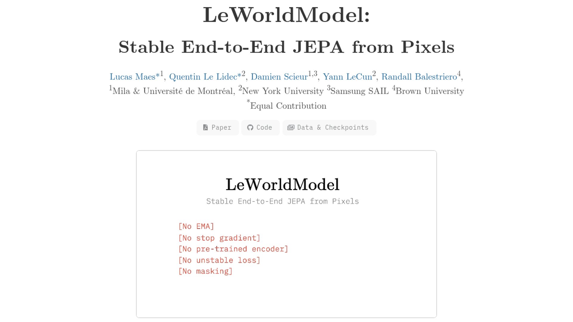 LeWorldModel is a new arXiv preprint from Yann LeCun and collaborators that claims stable end-to-end JEPA training directly from raw pixels with just a next-embedding loss and a Gaussian latent regularizer. The pitch is a simpler world-model recipe with fewer knobs and much faster planning on 2D and 3D control tasks.