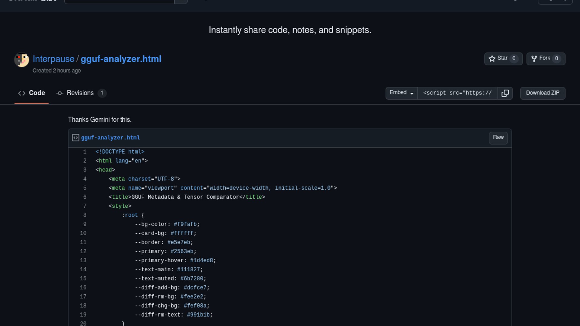 This single-file HTML gist lets you compare GGUF model metadata, tensor shapes, and layer quantization levels side by side. It’s a quick way to spot whether different omnicoder quants actually match before you waste time loading or benchmarking the wrong one.