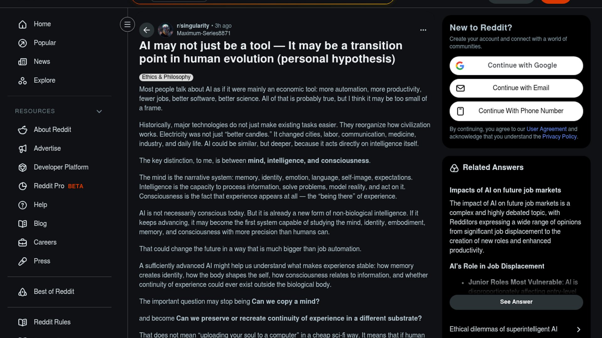 A philosophical proposal frames AI as a civilizational transition point rather than a mere productivity tool, suggesting it will eventually redesign the conditions of intelligence itself. The thesis argues that advanced AI could enable post-biological continuity of experience by helping humans understand the fundamental relationship between memory, identity, and consciousness.