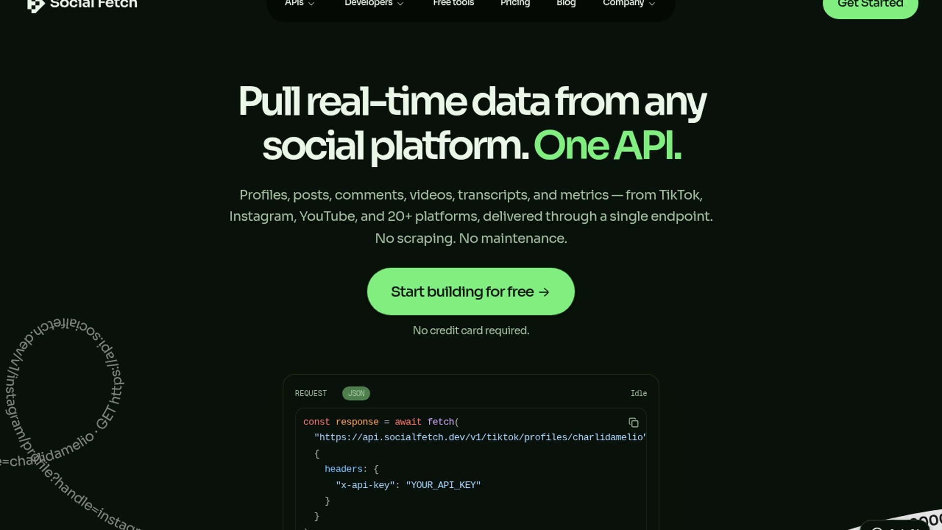 Social Fetch is a single REST API for public social data, covering profiles, posts, comments, videos, transcripts, and metrics across TikTok, Instagram, YouTube, X, LinkedIn, and Facebook. It emphasizes normalized JSON, pay-as-you-go credits, no rate limits, and a low-friction free tier with 100 free credits and no card required.
