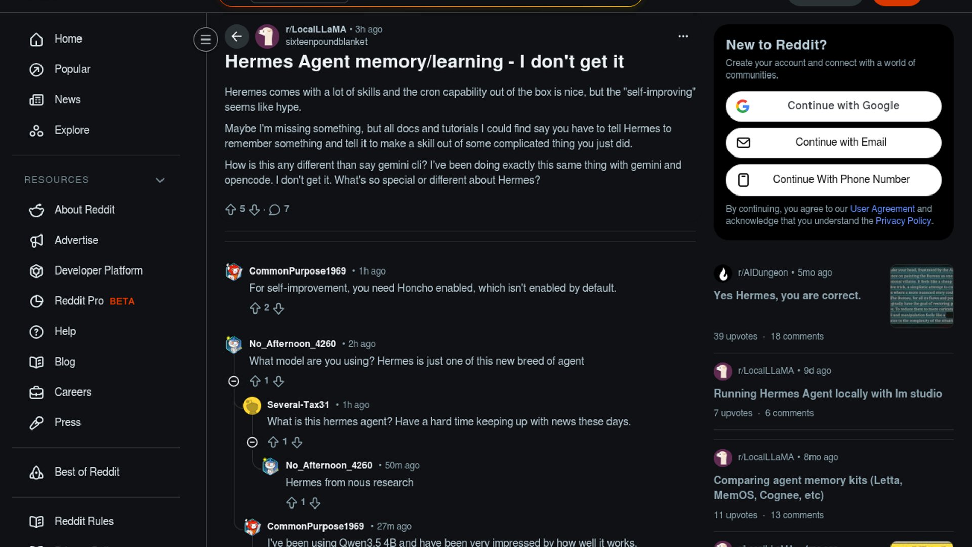 The Reddit thread pushes back on Nous Research's Hermes Agent pitch, arguing that its memory and skill-building look a lot like the same manual "remember this / save this workflow" loop users already run in Gemini CLI or opencode. What feels different is the packaging: bounded persistent memory, reusable skills, and a deeper user-modeling layer rather than magic autonomous learning.
