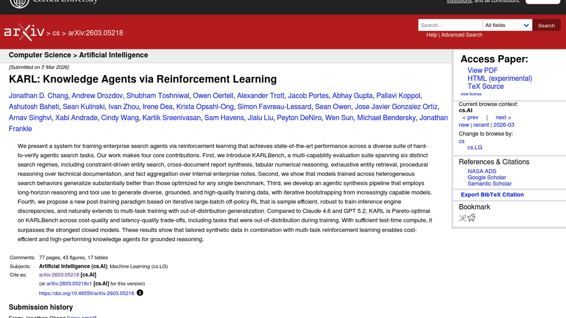 Databricks AI Research has introduced KARL, a knowledge-agent system for enterprise retrieval and grounded reasoning trained with synthetic data and off-policy reinforcement learning. The paper claims state-of-the-art results on the new KARLBench suite and says KARL reaches better cost, latency, and quality tradeoffs than frontier closed models on many enterprise search tasks.