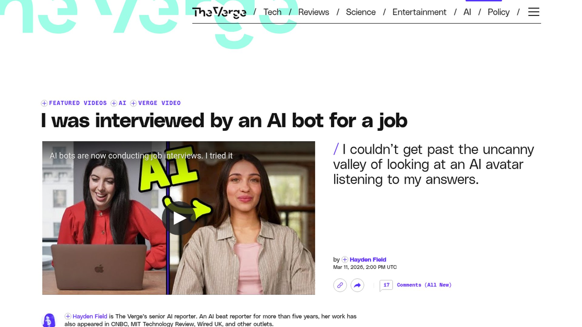 The Verge reporter Hayden Field personally underwent AI-conducted job interviews across multiple platforms, documenting the dehumanizing experience firsthand. The piece highlights growing industry adoption — roughly 1 in 4 companies now uses AI to run interviews — alongside serious concerns about bias and employer accountability.