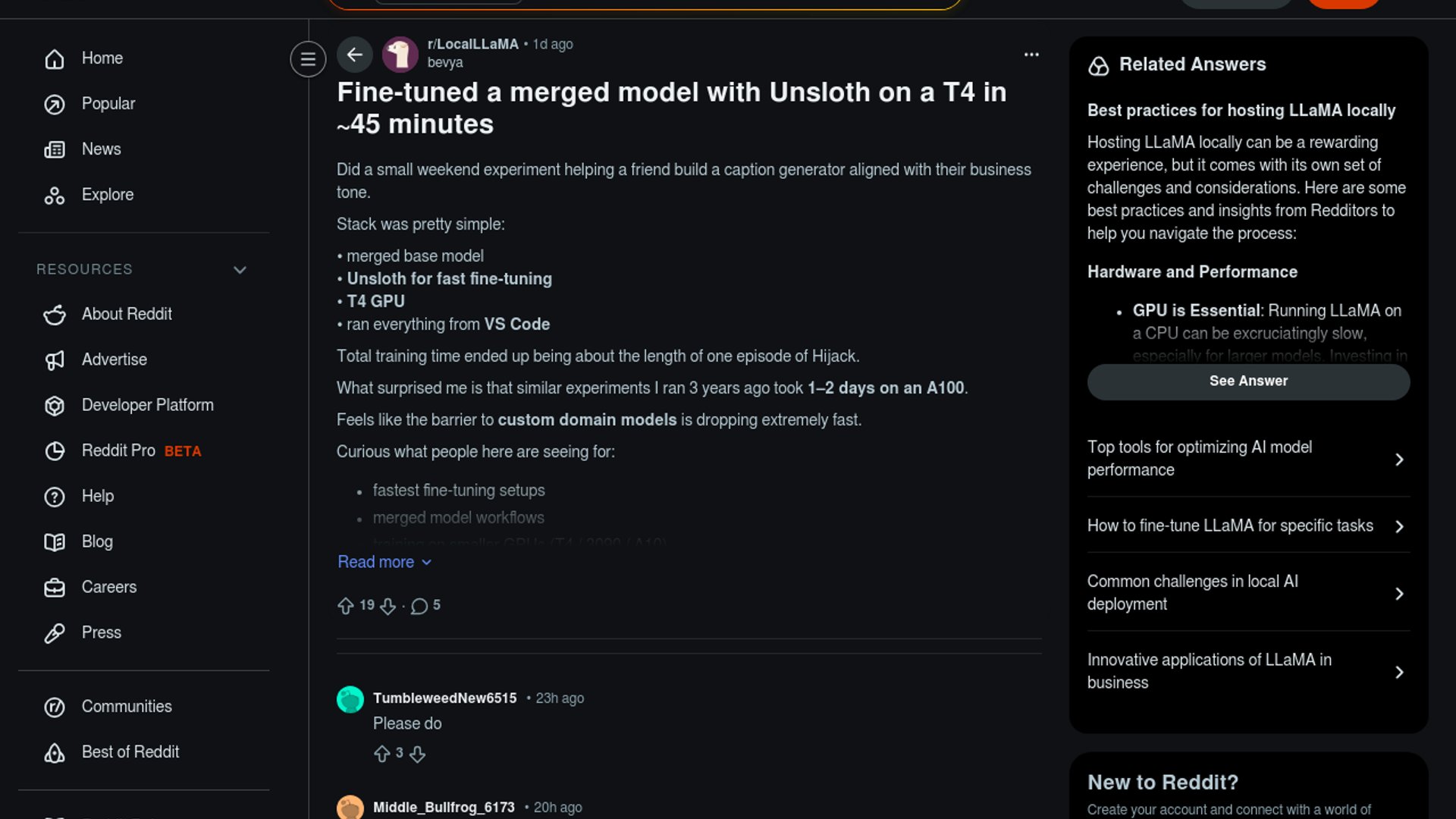 A LocalLLaMA user reports fine-tuning a merged captioning model with Unsloth on an NVIDIA T4 in about 45 minutes from VS Code. The post is anecdotal community evidence rather than an official benchmark, but it suggests low-cost GPUs can handle practical LLM customization.