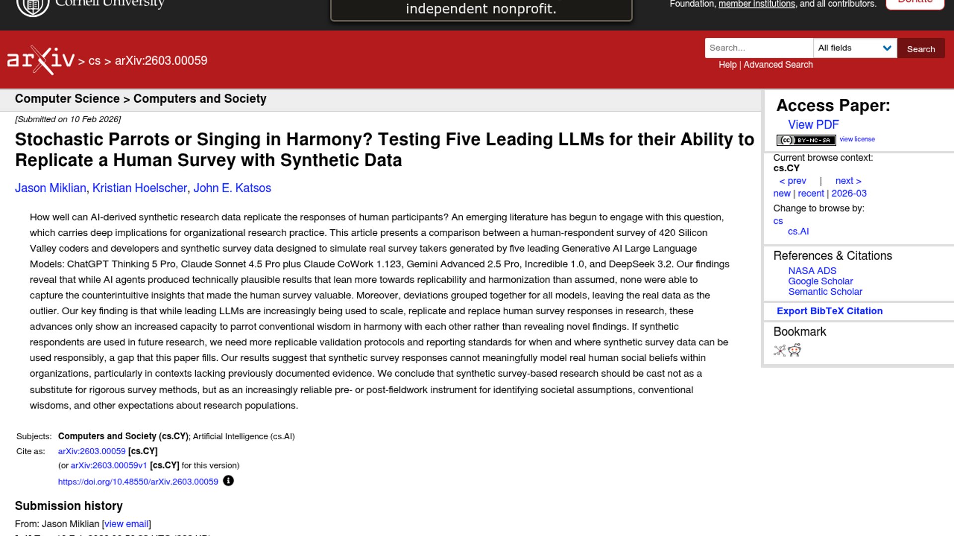 The paper compares a human survey of 420 Silicon Valley coders and developers with synthetic respondents generated by five frontier LLM setups. The models can produce plausible, broadly aligned answers, but they fail to reproduce the surprising findings that make the human data useful.