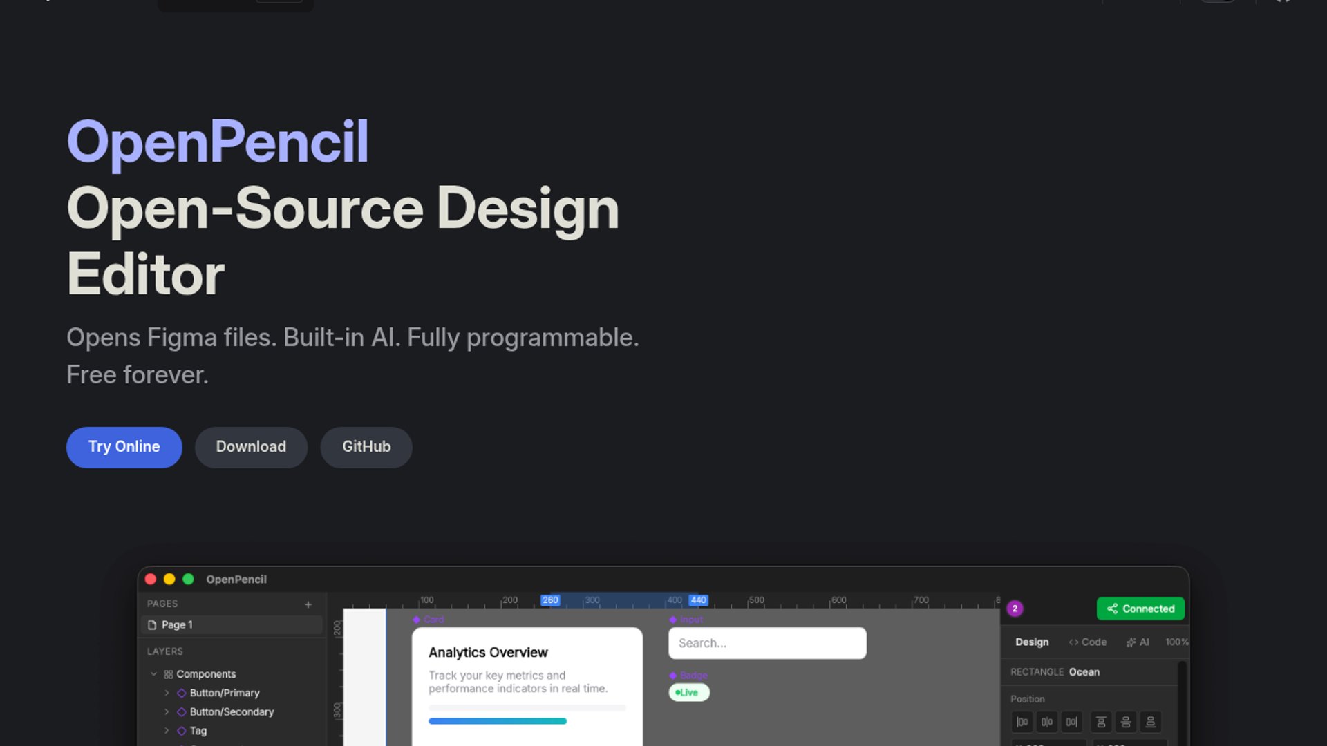 - –OpenPencil positions itself as a full-stack workflow, not just a canvas: `.fig` round-trip, CLI, MCP server, and AI-assisted editing.