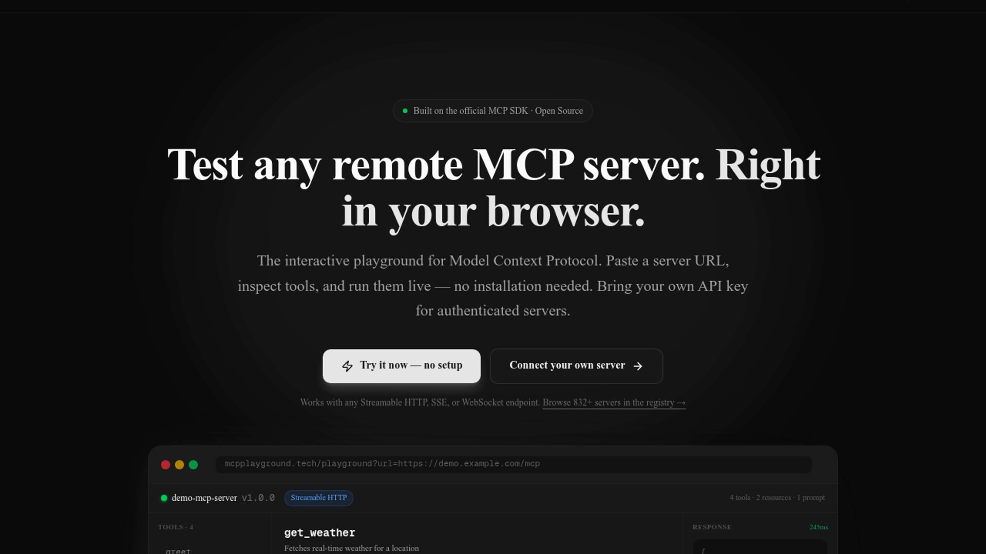 MCP Playground is an open-source, browser-based tool for inspecting and running remote MCP servers, and this update turns it into a more serious ops and quality layer. The new Schema Linter grades servers A–F using 15+ checks across tool descriptions, JSON Schema completeness, naming, duplicates, and metadata, while also estimating token cost per tool. The release also adds a CORS-enabled public REST API for health checks, inspection, and registry queries, plus support for ws:// and wss:// transports alongside HTTP and SSE.