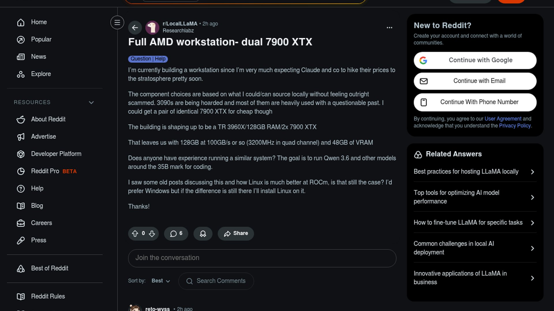 This Reddit post asks whether a Threadripper 3960X build with 128GB RAM and two Radeon RX 7900 XTX cards is a practical local-inference machine for coding models around the 35B range. It also asks whether Linux still has the edge for ROCm, or whether AMD’s newer Windows support is good enough now.