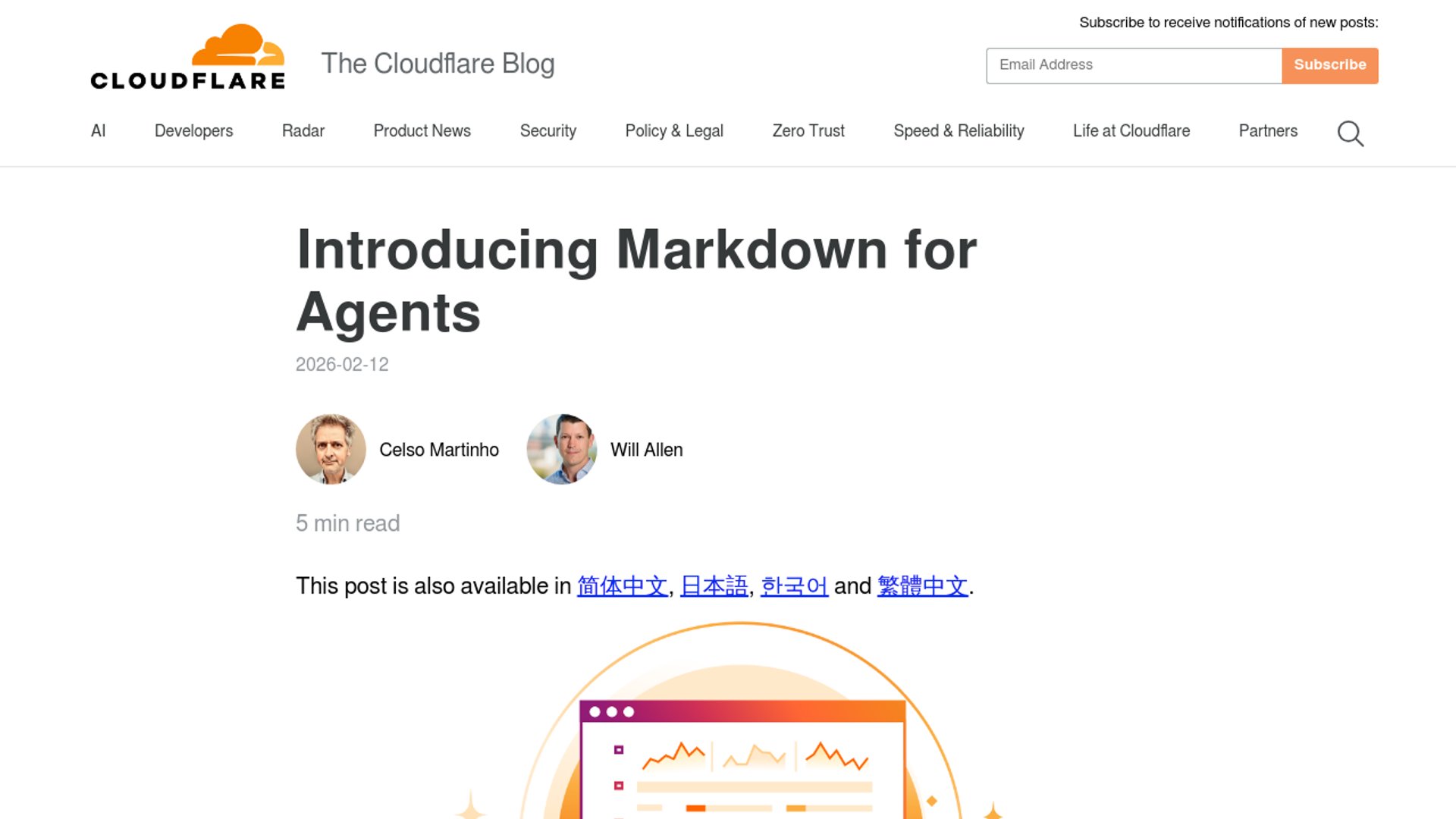 Cloudflare's new beta feature automatically converts web pages to Markdown at the edge when AI agents send an `Accept: text/markdown` HTTP header, cutting token usage by up to 80% at no extra cost. Available via a single dashboard toggle for Pro, Business, and Enterprise plans — no origin code changes required.