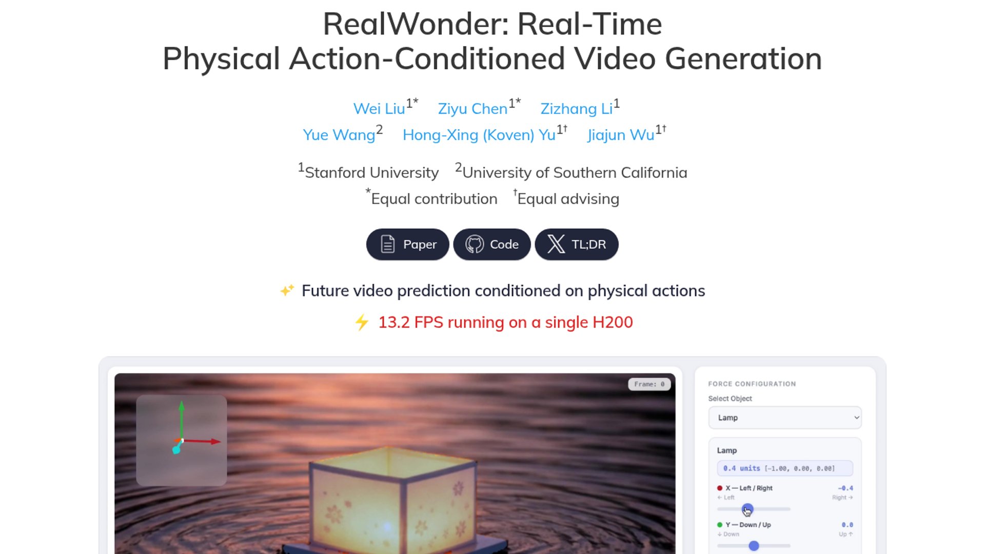 RealWonder is a Stanford-led research project that generates real-time video from a single image while responding to physical actions like forces, robot gripper motion, wind, and camera movement. The key idea is to run physics simulation first, then feed those results into a distilled 4-step video generator, reaching 13.2 FPS at 480×832 and pushing video models closer to usable world simulators.