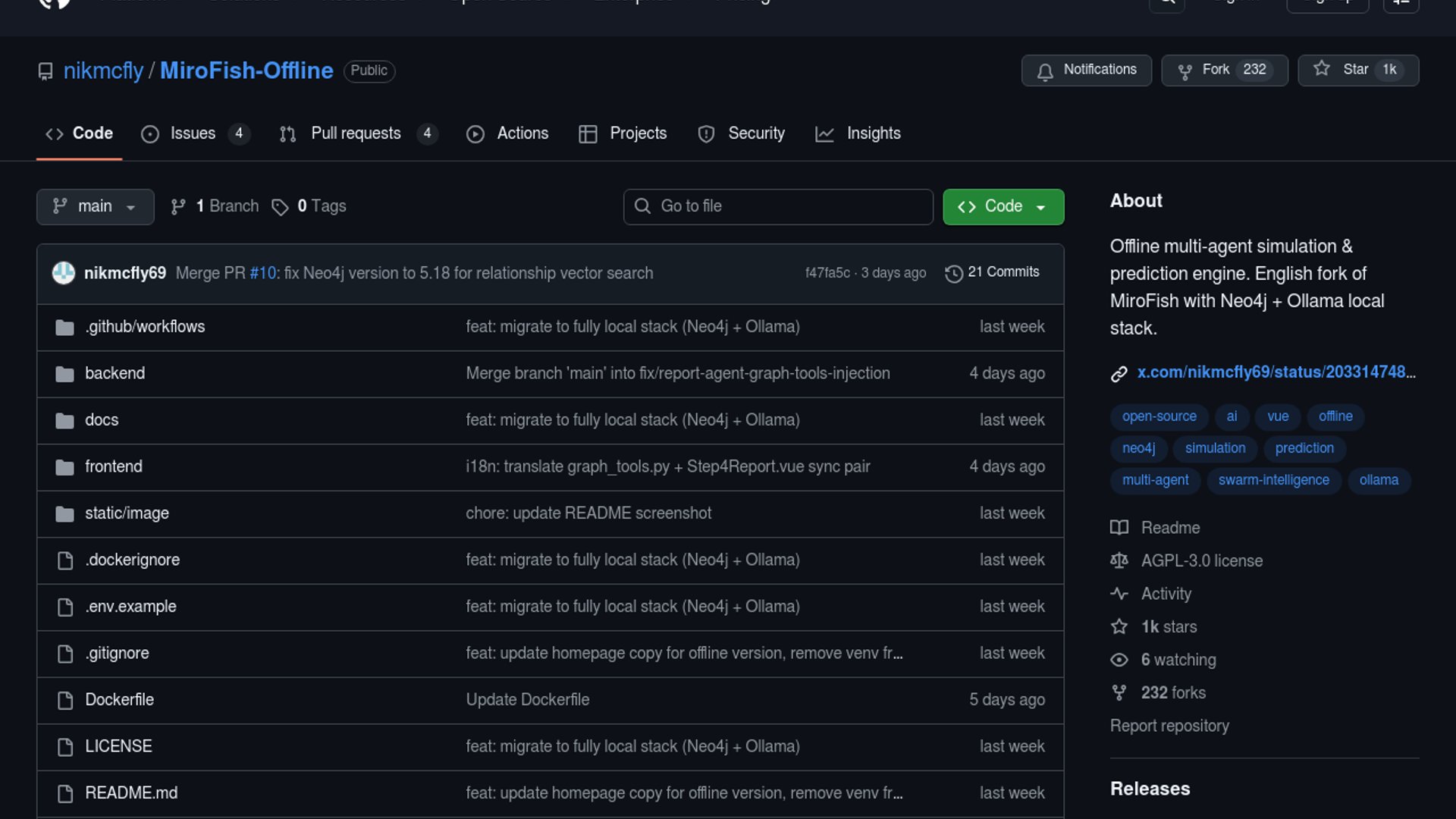 MiroFish-Offline is a fully local fork of MiroFish, the multi-agent simulation engine that turns uploaded documents into large populations of AI personas and simulates how public opinion, market sentiment, and social dynamics evolve over time. This fork replaces the original cloud-dependent stack with Neo4j Community Edition for graph memory and Ollama-hosted models for both inference and embeddings, while also translating the interface into English. The result is an offline-capable system for crisis testing, policy analysis, and market-scenario exploration that runs entirely on the user’s hardware.