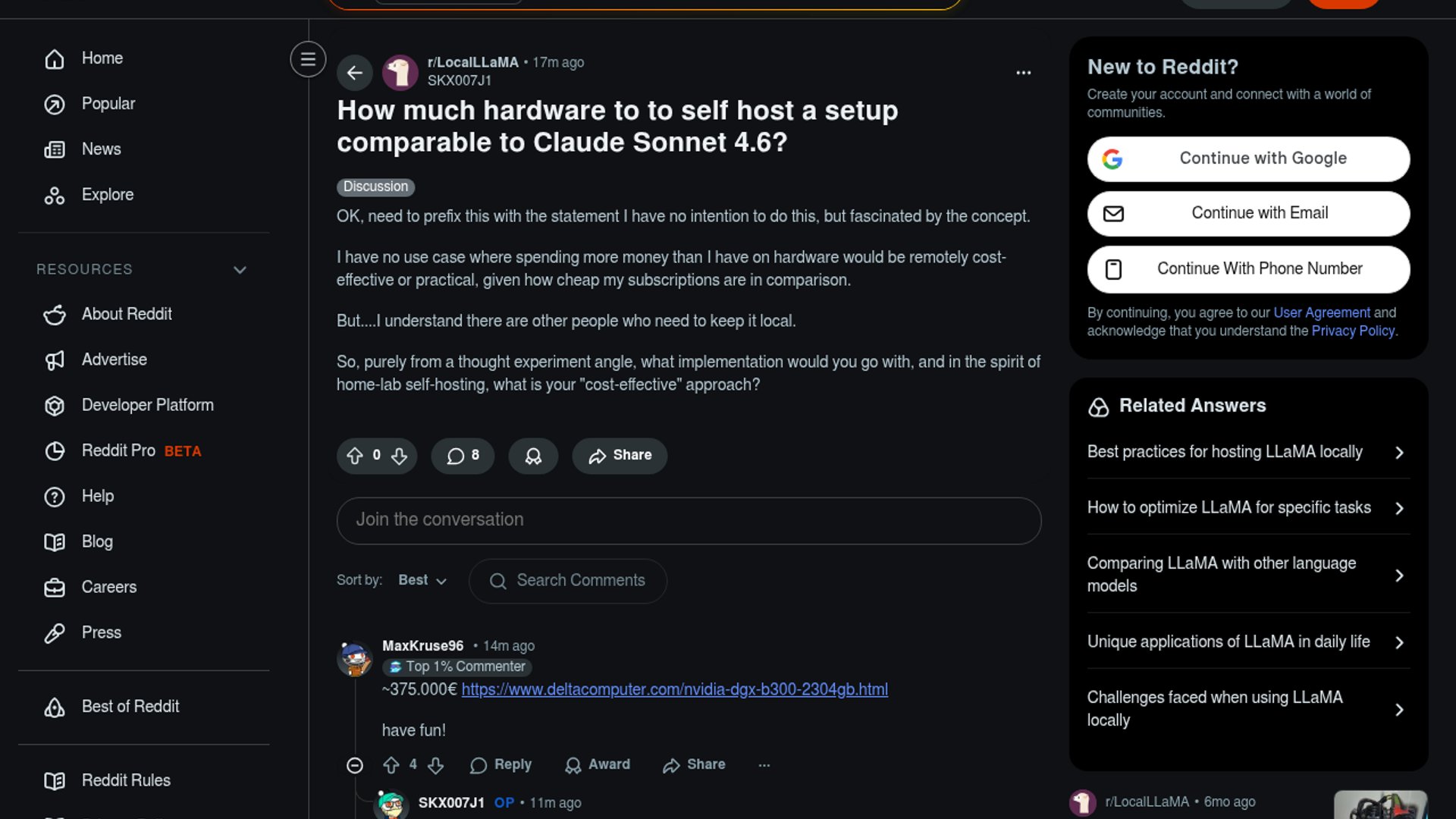 This Reddit thread on r/LocalLLaMA is a thought experiment about the hardware needed to self-host a setup comparable to Claude Sonnet 4.6. The poster makes clear they do not plan to do it, but want a realistic view of what “cost-effective” looks like for people who need local-only inference. Early replies lean bluntly pessimistic: one commenter cites a DGX B300 class system around 375,000 euros, while another argues consumer GPUs are a poor value for frontier-level local LLM work and says you should generally use what you already have.