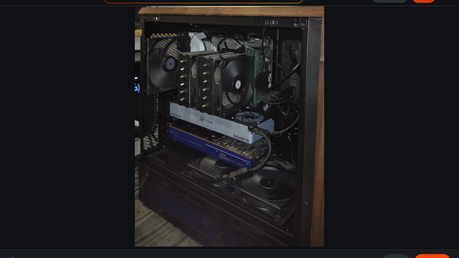 This Reddit post details a self-built, budget-conscious local AI machine centered on an AM4 platform, 128GB of DDR4, and two AMD Radeon Pro GPUs running on Linux with ROCm and llama.cpp. The builder describes careful thermal tuning, GPU undervolting, split-layer inference for larger models, and practical tradeoffs made to maximize local model performance without moving to a newer platform.