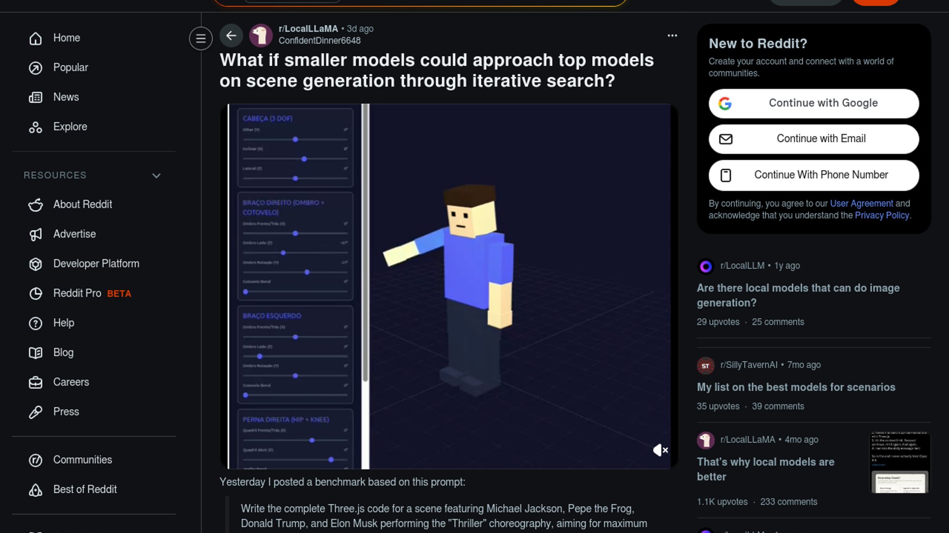 A LocalLLaMA post proposes an iterative benchmark where smaller models attempt to recreate 3D scenes in Three.js, render the output via Playwright, compare screenshots to the target, and self-correct across multiple rounds. The author found that step-by-step decomposition already helped Gemini Flash produce a scene it couldn't generate in one shot.
