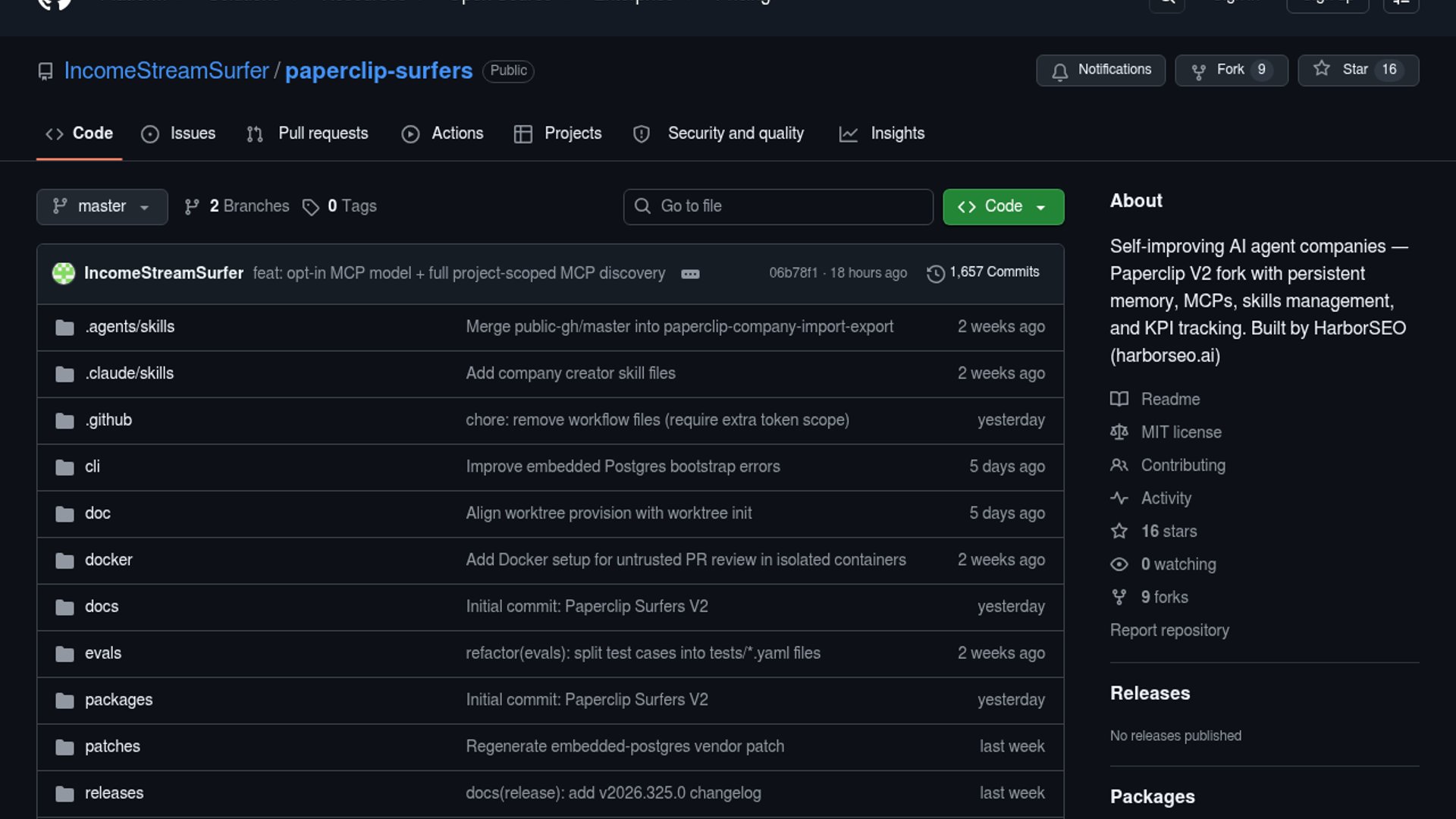 Paperclip Surfers, an open-source fork of Paperclip for managing AI agent companies, adds persistent conversations, project and global memory, MCP syncing, per-agent skill selection, and performance analytics. The update reads like a real V2 rather than a cosmetic refresh, pushing the project toward a fuller agent-ops stack.