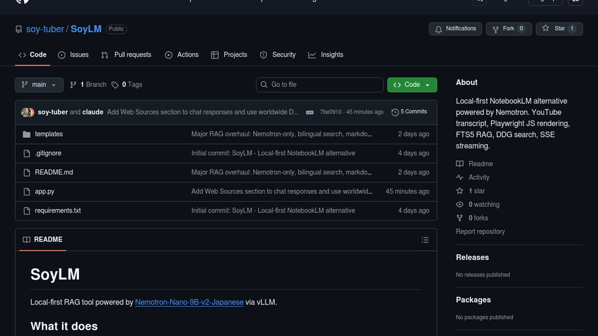 SoyLM is a new open-source, local-first RAG app that lets users ingest files, web pages, and YouTube transcripts, then chat with those sources without relying on cloud LLM APIs. The project runs on FastAPI with Nemotron via vLLM, SQLite FTS5/BM25 retrieval, and optional DuckDuckGo web search.
