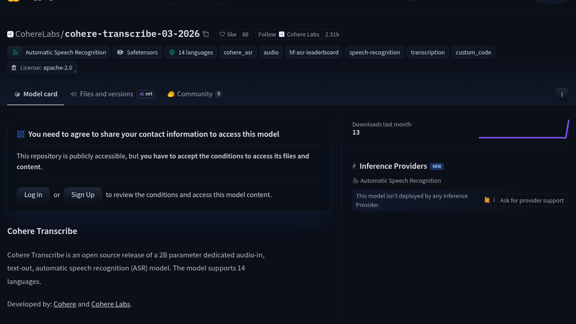 Cohere Labs released Cohere Transcribe, an open-source 2B-parameter speech-to-text model on Hugging Face that supports 14 languages. It uses a Conformer encoder and Transformer decoder, and it is aimed at offline transcription and production serving via transformers or vLLM.