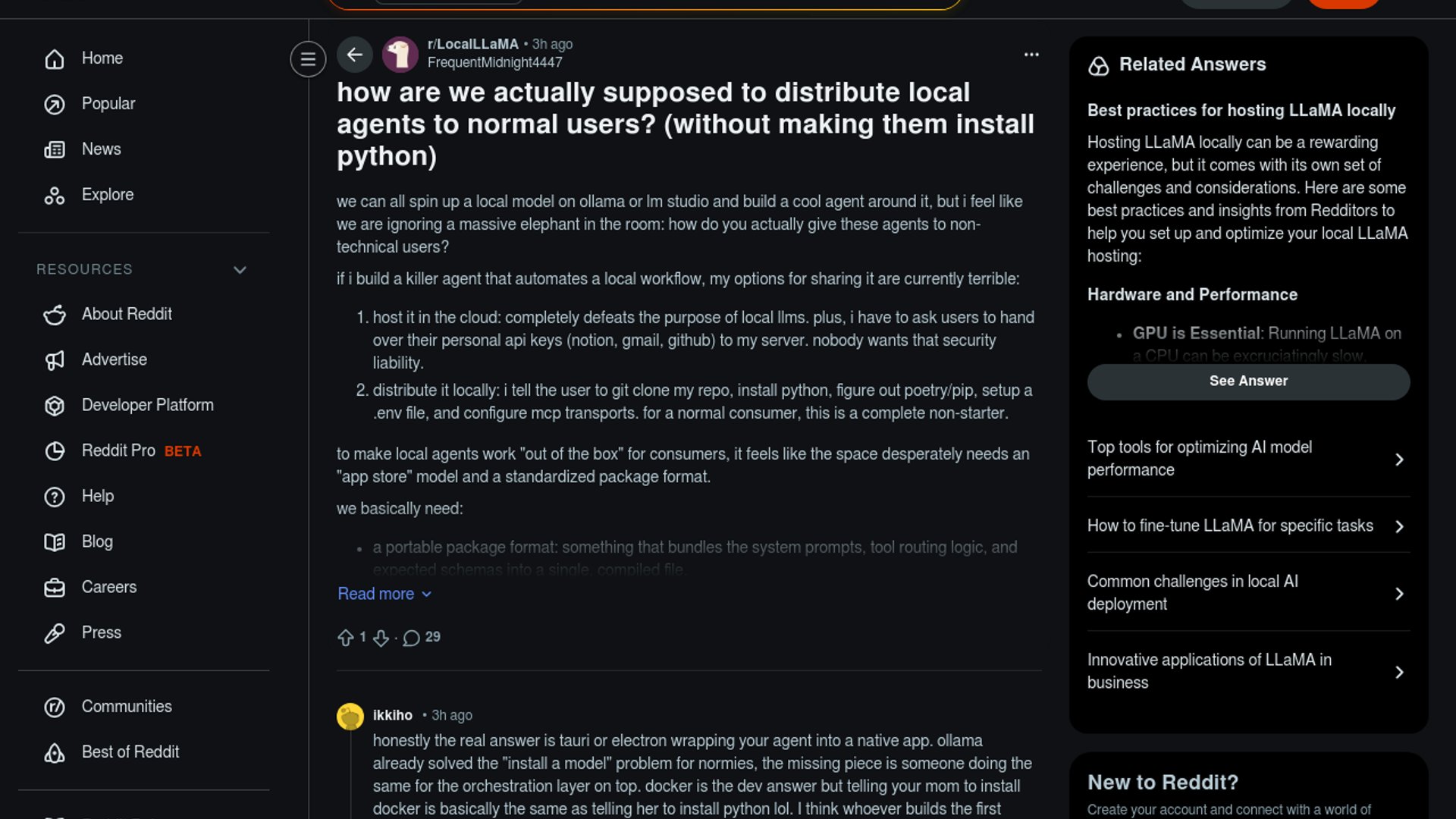 A developer discussion on r/LocalLLaMA surfaces a growing pain point: there is no practical way to distribute locally-running AI agents to non-technical users without requiring Python installs, environment setup, and terminal literacy. The post argues the ecosystem needs a portable package format, sandboxed desktop client, and local credential vault before local agents can reach mainstream consumers.