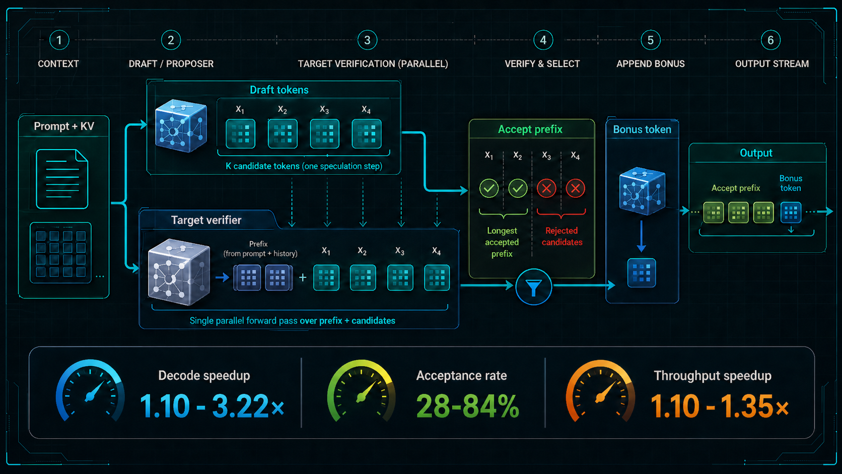 - –Learned heads like EAGLE-3 and Medusa-1 are fundamentally different from draft-model speculation because they attach speculation to internal model representations instead of relying on a separate smaller LM.