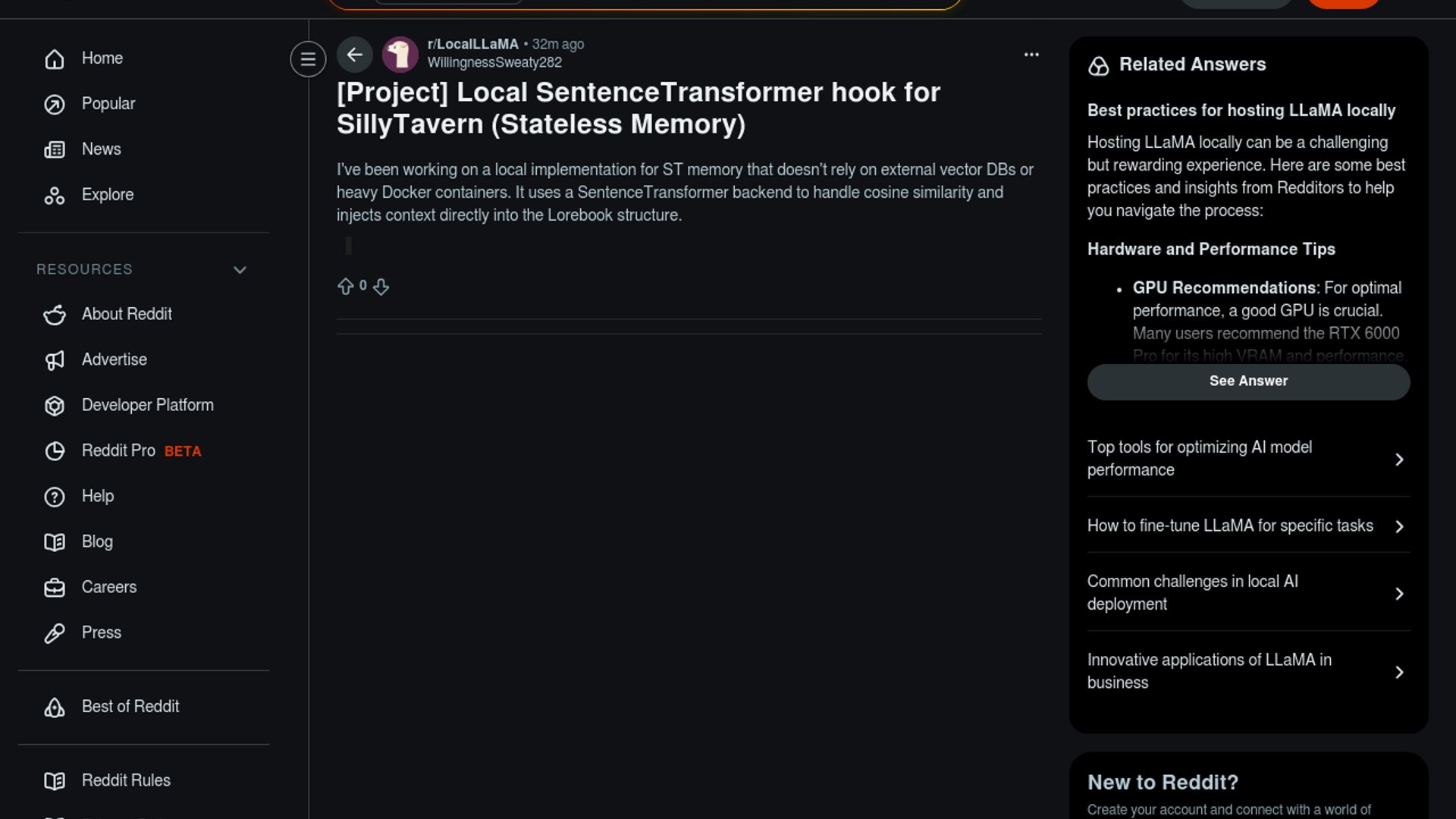 A Reddit project post outlines a local SillyTavern memory hook that uses SentenceTransformer cosine similarity to surface relevant lore without a separate vector database or Docker stack. It reads more like a proof of concept than a launch, but the design is a clean fit for fully local memory inside ST's existing Lorebook system.