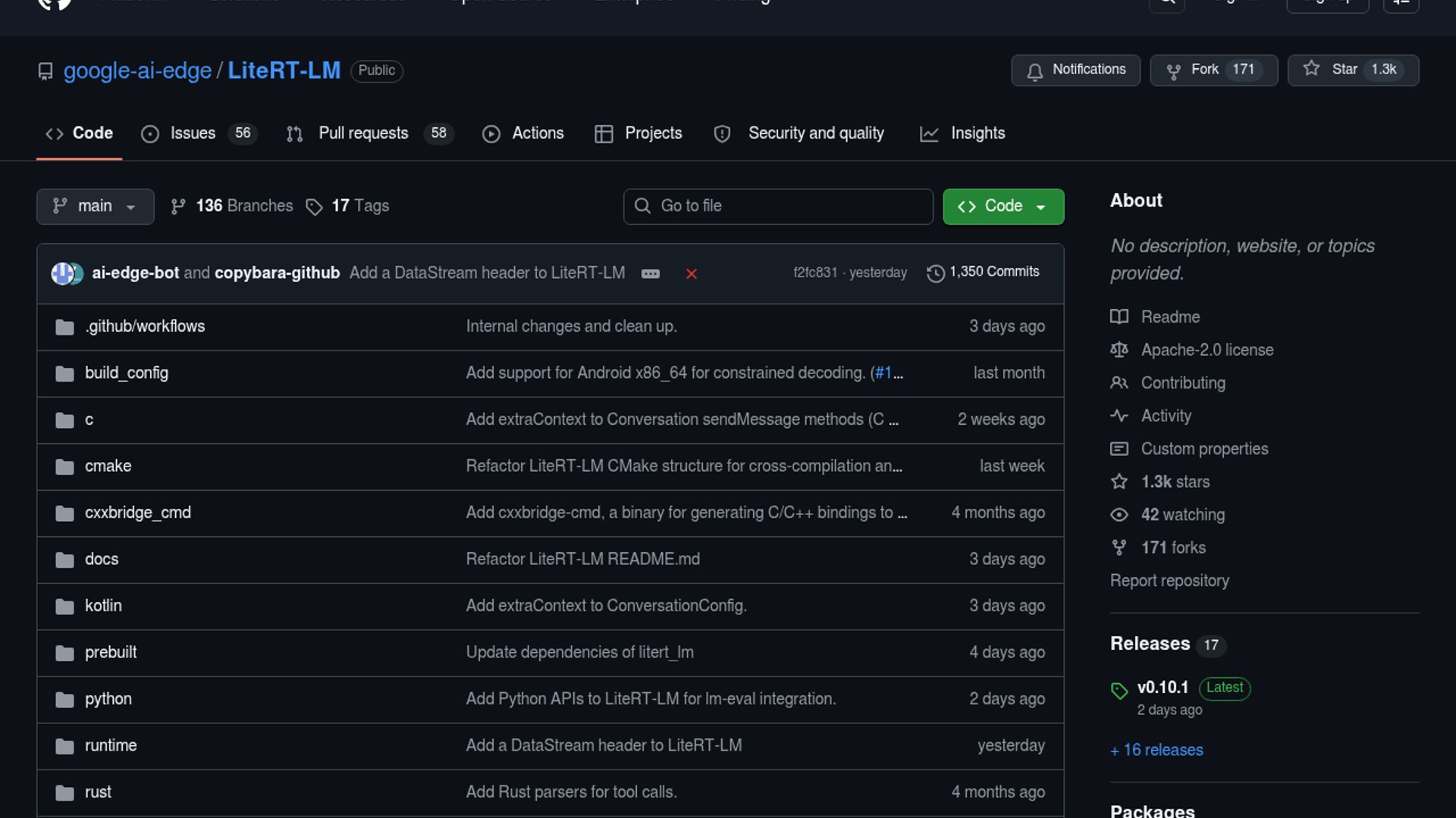 LiteRT-LM is Google AI Edge’s open-source inference framework for running LLMs on edge devices, with support for Android, iOS, web, desktop, and Raspberry Pi. The repo now emphasizes Gemma 4 support, hardware acceleration, multimodality, and tool use for production on-device GenAI.