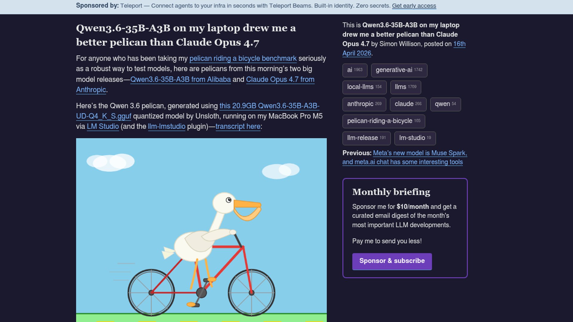 - –Willison’s comparison is deliberately absurd, but it’s a useful reminder that model quality is now multi-dimensional: a model can be “worse” overall and still be better at a specific task on consumer hardware.