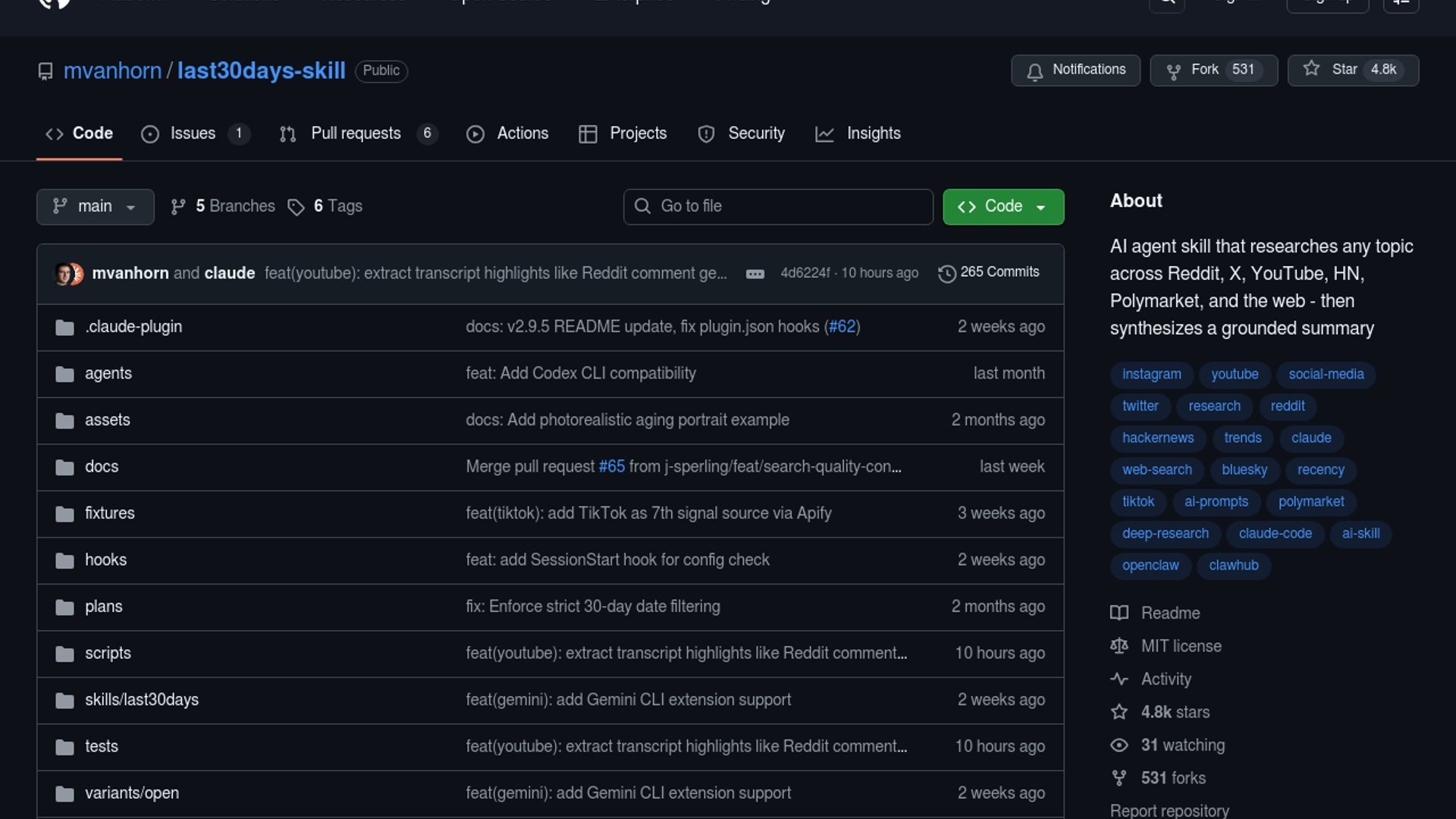 mvanhorn's last30days is a Claude Code skill that pulls recent signals from Reddit, X, YouTube, Hacker News, Polymarket, and the web, then synthesizes them into cited research briefs. The current v2.9.5 README shows it has already expanded beyond the scraped blurb into Bluesky, Truth Social, TikTok, Instagram, comparative mode, and per-project config.