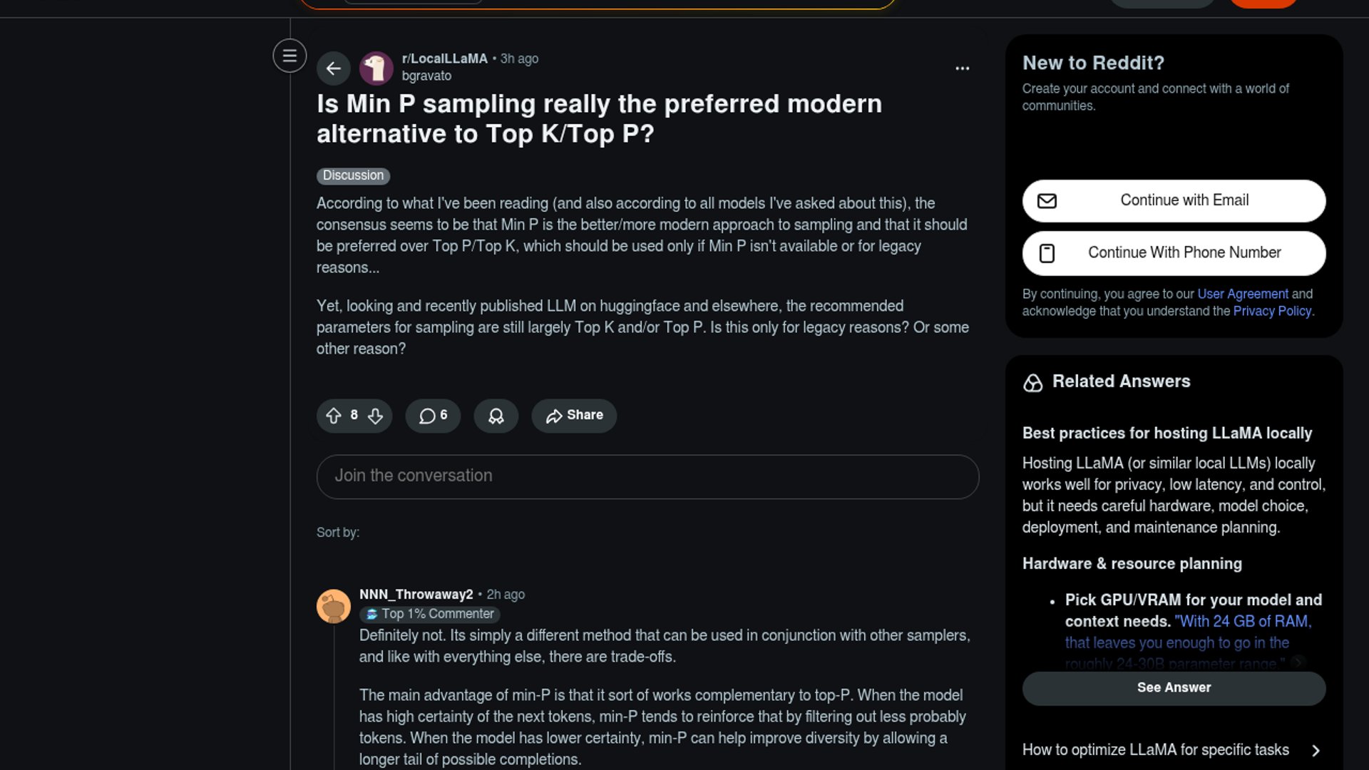 The thread asks why Min-P hasn’t displaced Top-K and Top-P in modern model configs, even though it’s increasingly discussed as the cleaner sampler. The short answer is that Min-P is promising, but it’s still an option rather than a universal default, so many model authors keep the older knobs for compatibility and predictability.
