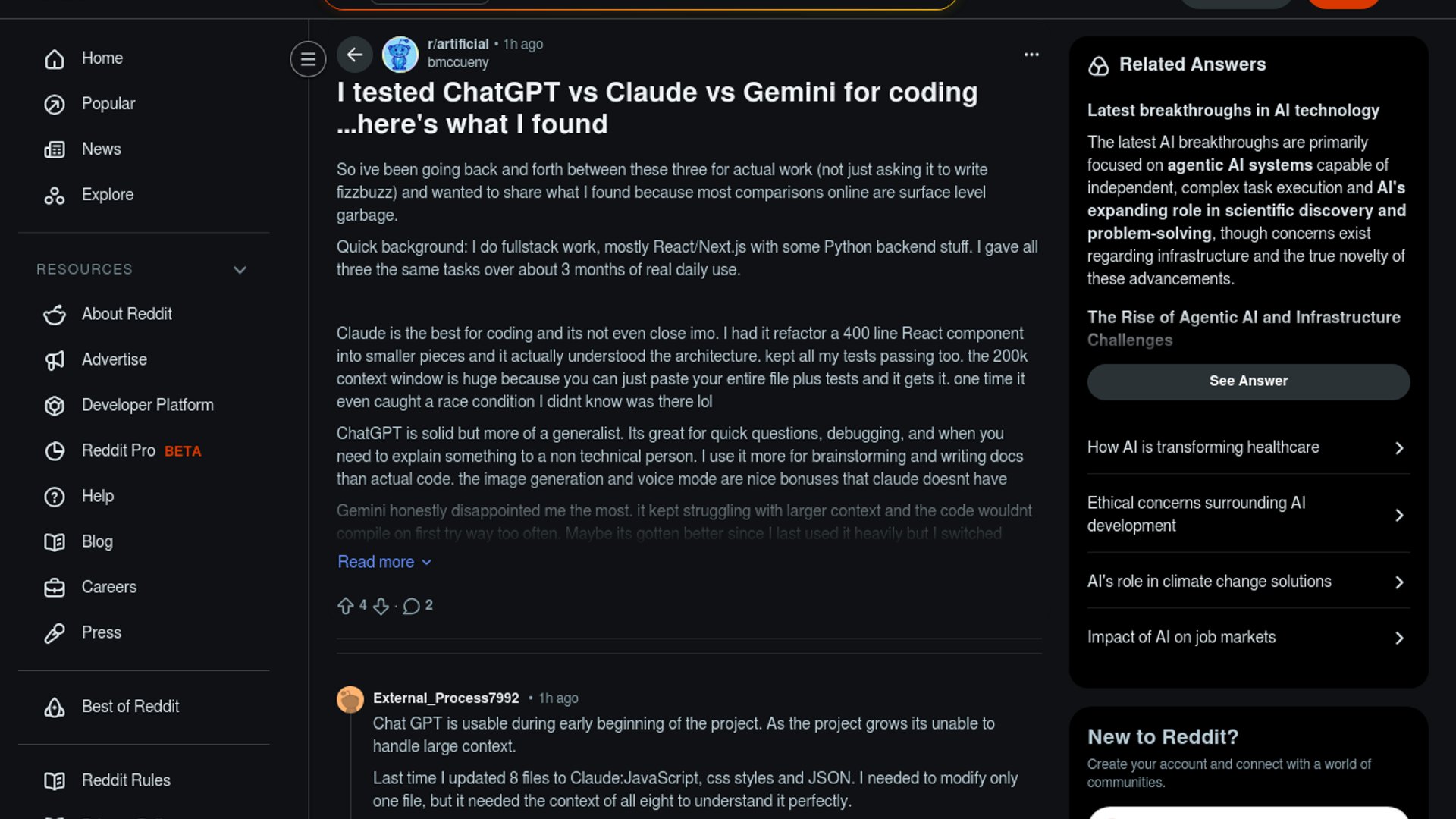 A Reddit developer who used all three for three months of real full-stack work says Claude is the clear winner for serious coding and refactors. ChatGPT comes off as the stronger generalist, while Gemini lags on larger-context tasks and first-pass compile reliability.