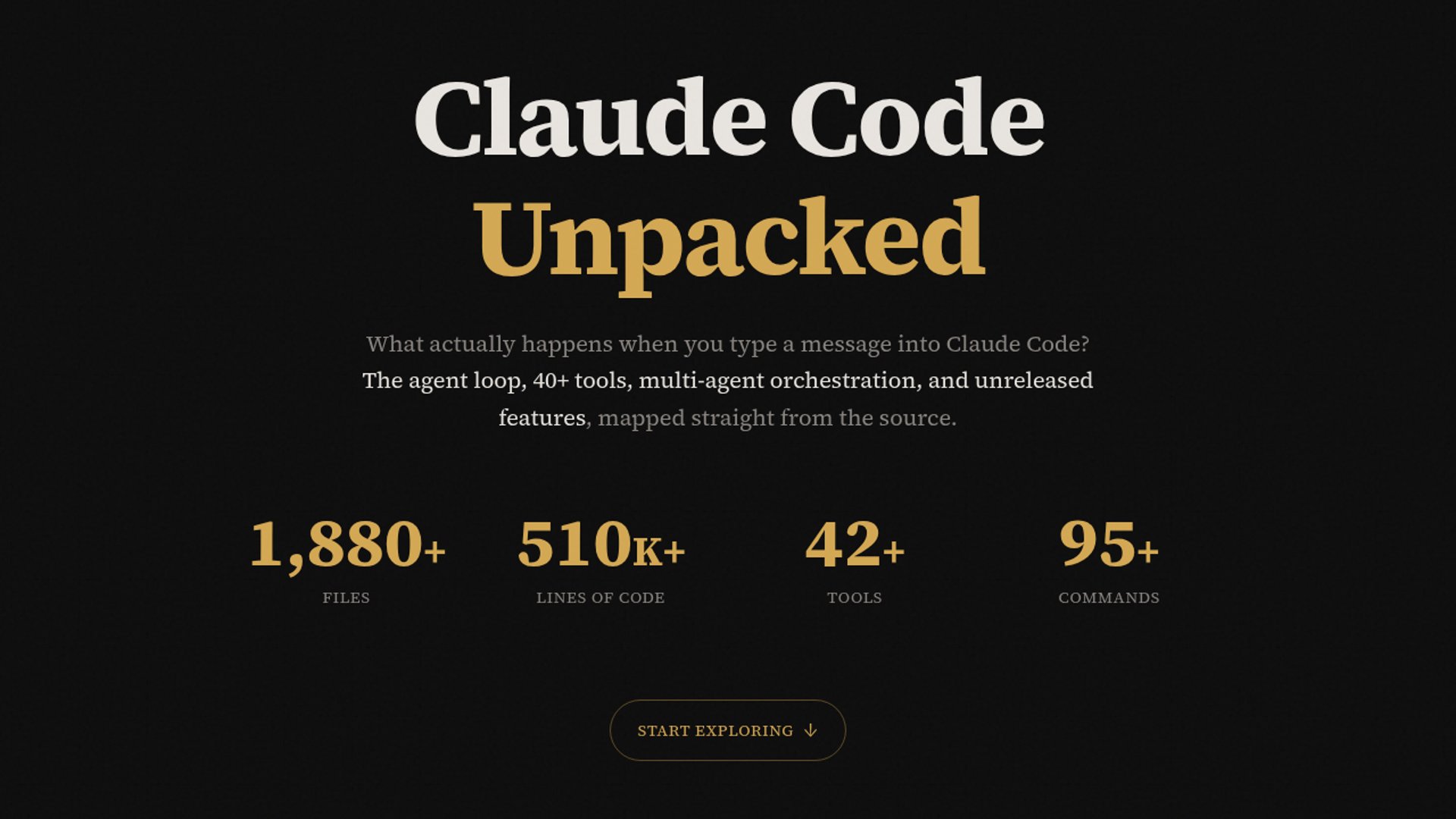 Claude Code Unpacked is an unofficial, interactive visual guide that breaks down the Claude Code source leak into a browsable map of the agent loop, tool system, command catalog, hidden features, and architecture. It presents the codebase as an explorable story rather than a raw dump, with sections for the input-to-render flow, tool categories, and unreleased capabilities like Coordinator Mode and Bridge.