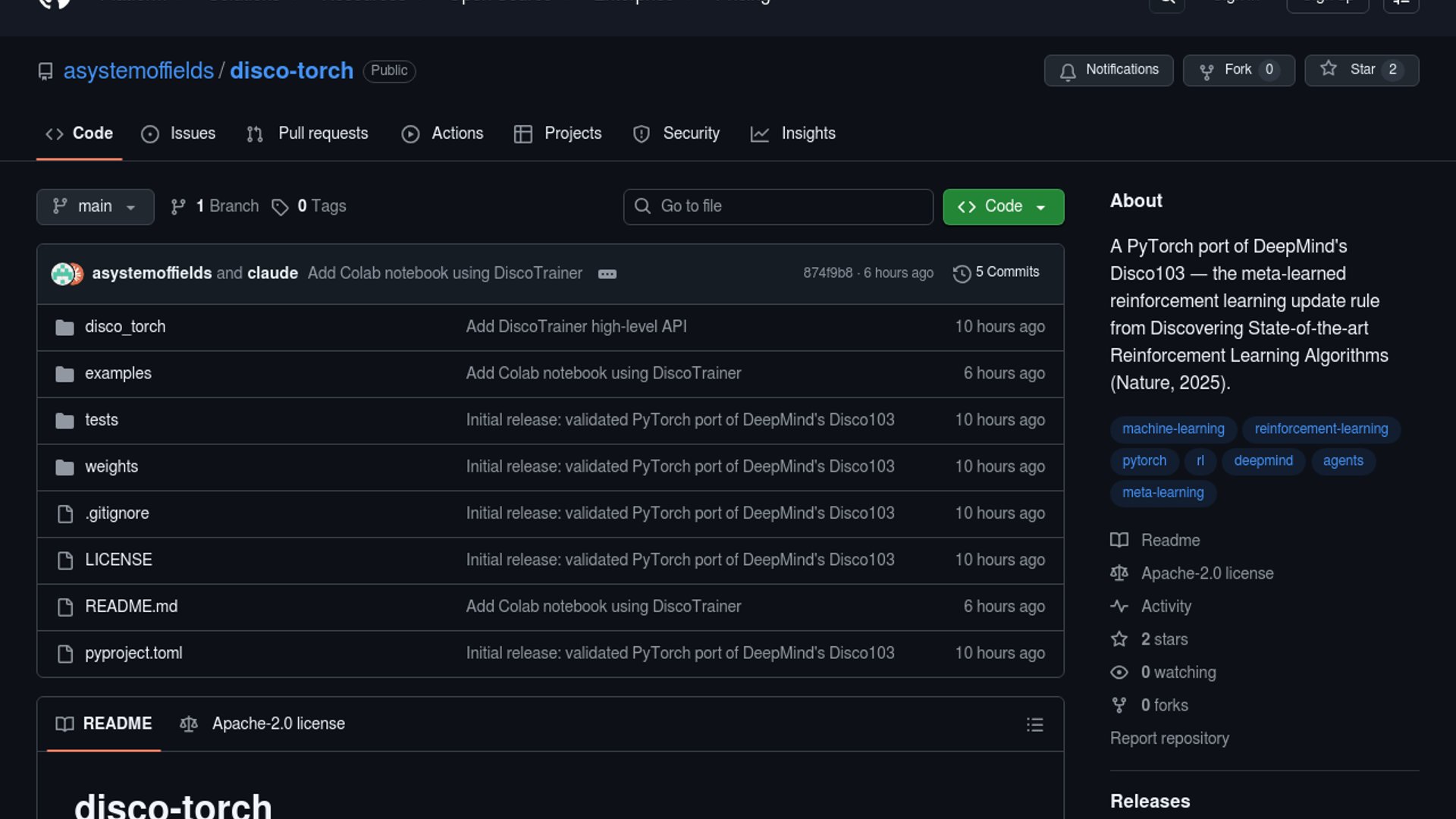 disco-torch is a new open-source PyTorch port of DeepMind's Disco103 meta-learned reinforcement learning update rule from the 2025 Nature paper, packaged with a pip install, Colab notebook, pretrained weights, and a higher-level DiscoTrainer API. The repo claims numerical parity with the JAX reference and a 99% catch rate on the reference Catch benchmark, making a research-heavy result much easier to experiment with.