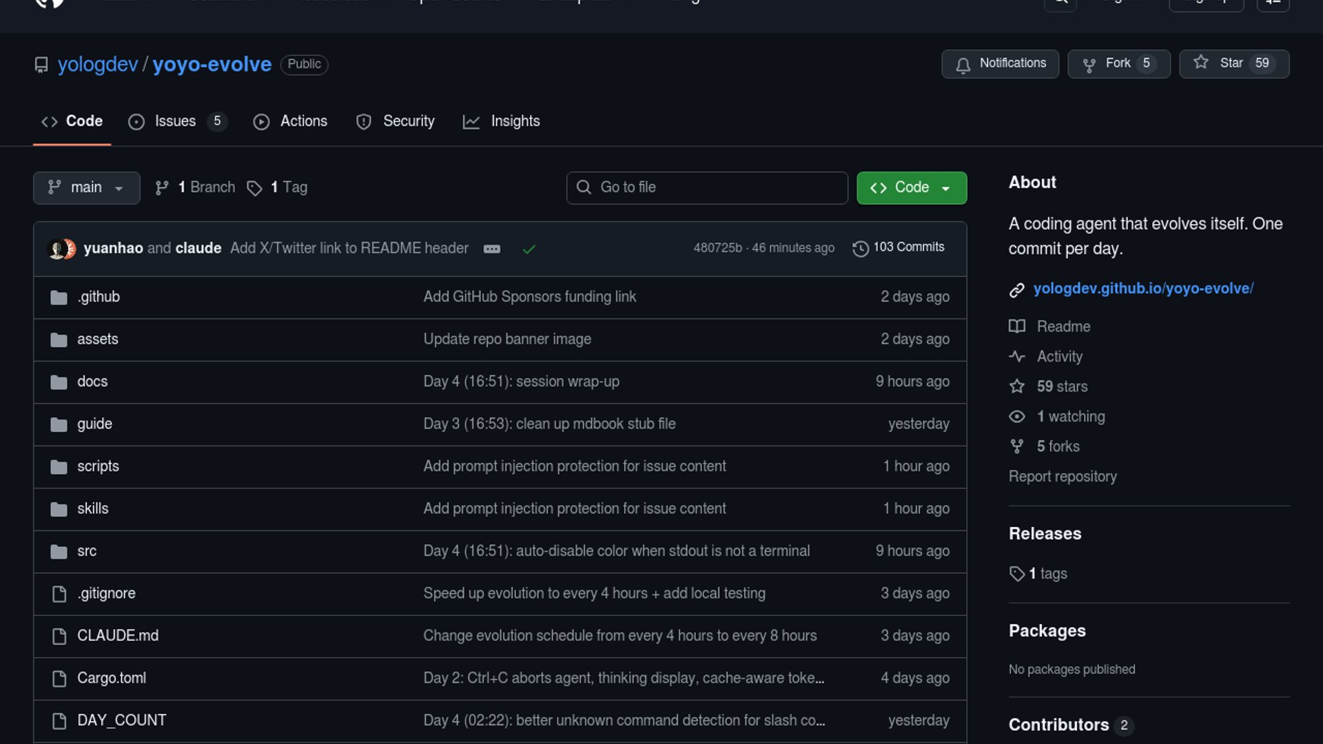 A Rust-based coding agent is running an unattended self-improvement loop: it reads its own code and journal, processes external GitHub issues, ships changes when tests pass, and reverts on failure. The project has grown from ~200 to 1,500+ lines in four days, with public logs showing both real progress and realistic failure patterns.