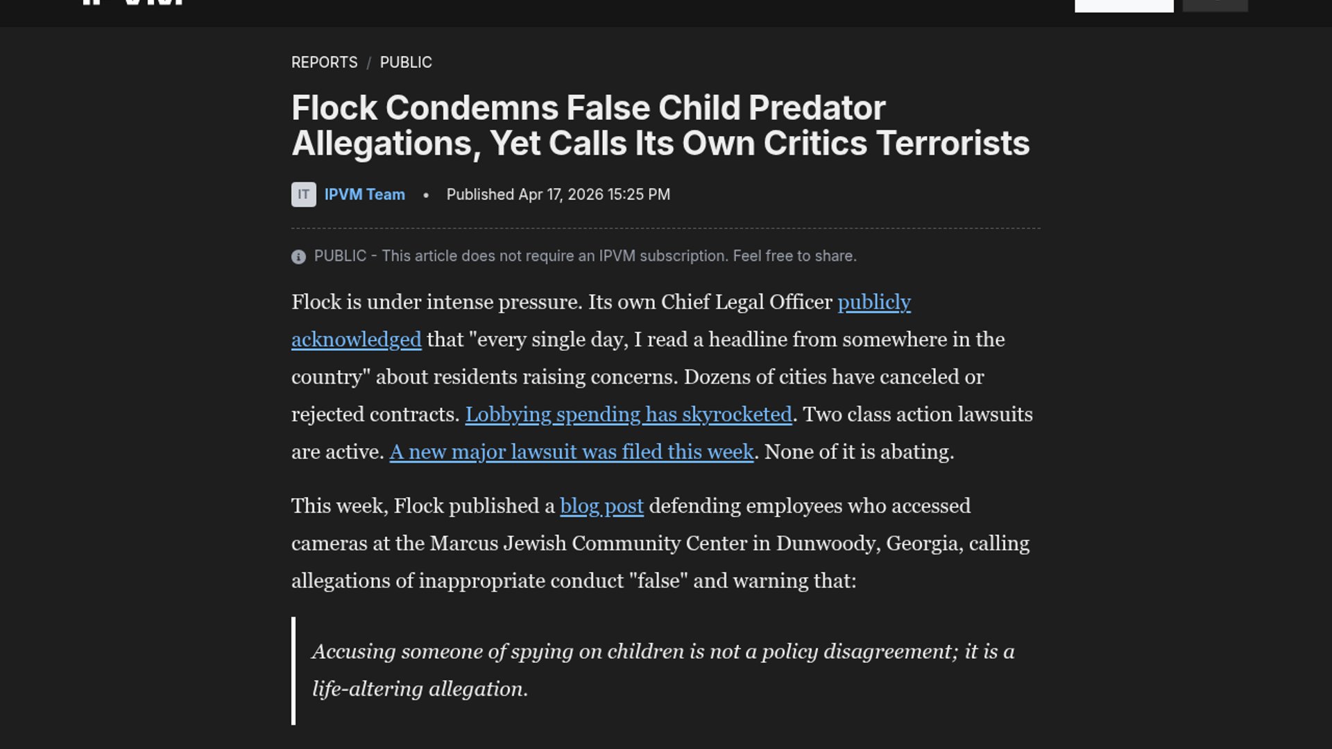Flock is not just fighting criticism here, it is escalating it. That may play well with some police customers, but it is a high-risk stance for a company selling always-on surveillance infrastructure.