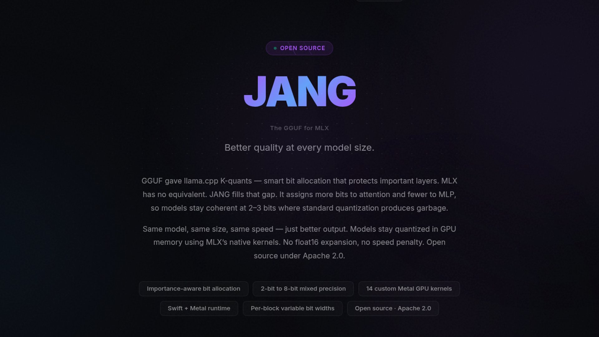 - –The repo frames JANG as “the GGUF equivalent for MLX,” but with models staying in GPU memory at full Metal speed, so this is both a format and runtime story.