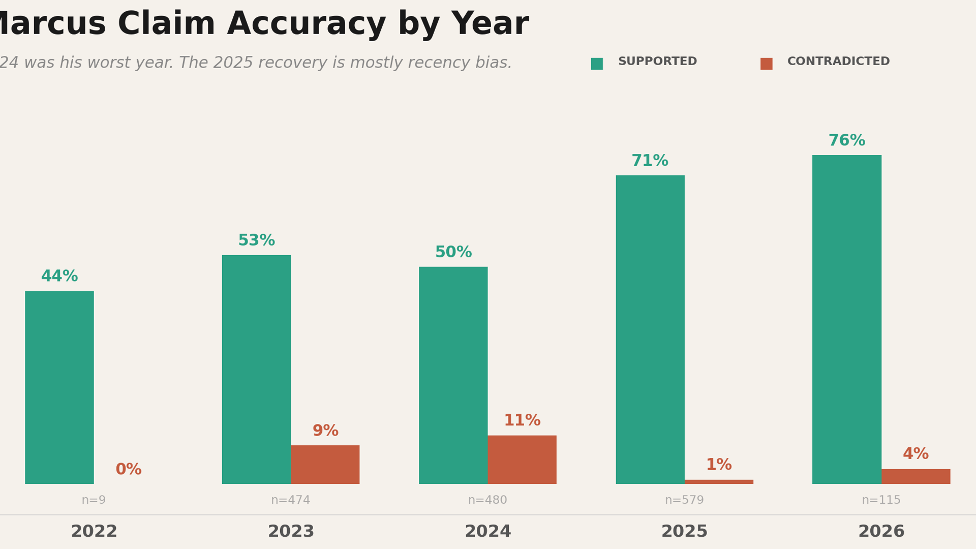 This open-source project extracts and scores 2,218 testable claims from 474 Gary Marcus Substack posts using two independent LLM pipelines plus a reconciliation layer. The published results show strong support for specific technical critiques, weaker support for market-crash predictions, and clear caveats that all labels are LLM-scored rather than human-verified.